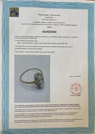 Prsten z kombinace zlata o ryzosti 585/1000 a 485/1000 (spodní část hlavy prstenu) a platiny o ryzosti 950/1000 (zasazení kamenů), osvědčení z PÚ. Váha 2,60 g, velikost 55,5, rozměr hlavy prstenu 15,5 x 9 mm. Kámen - přírodní diamant routa - 12 ks.