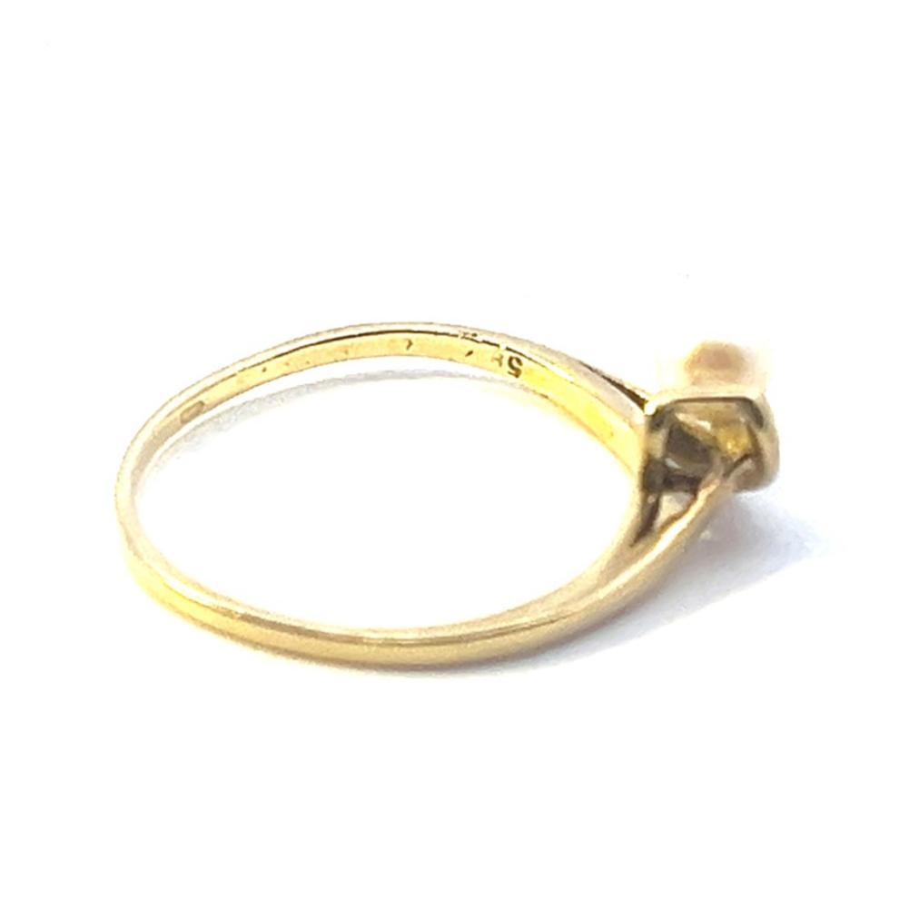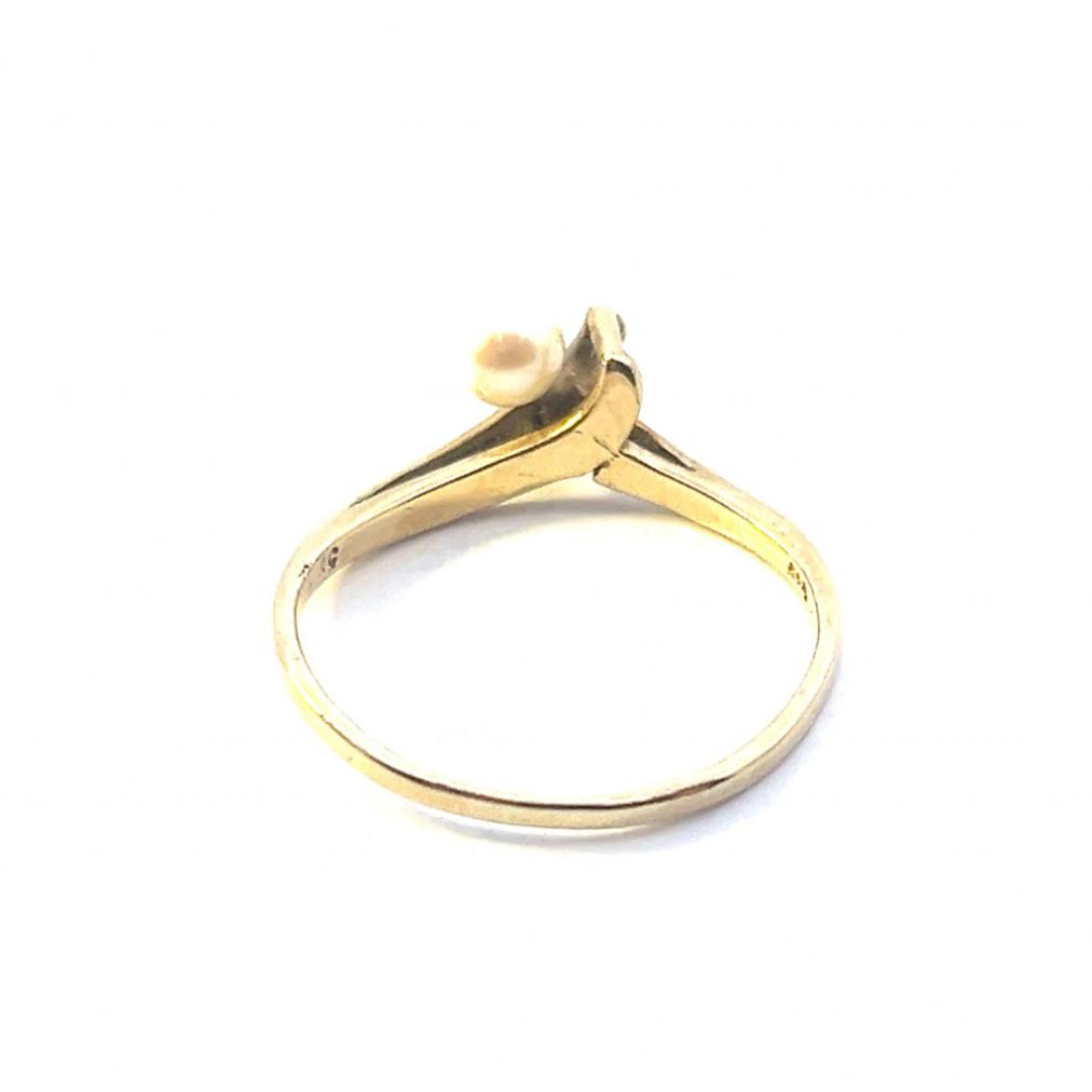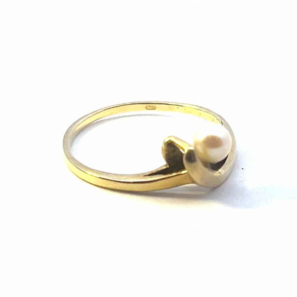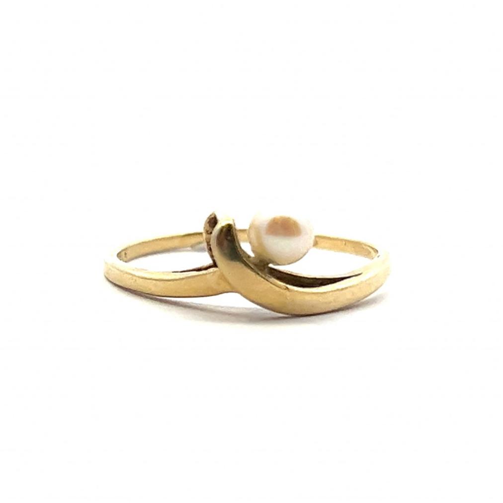 Zlatý prsten o ryzosti 585/1000, punc labuť. Velikost 51, váha 1,35 g, v nejširším bodě 7 mm, průměr perly 4 mm.