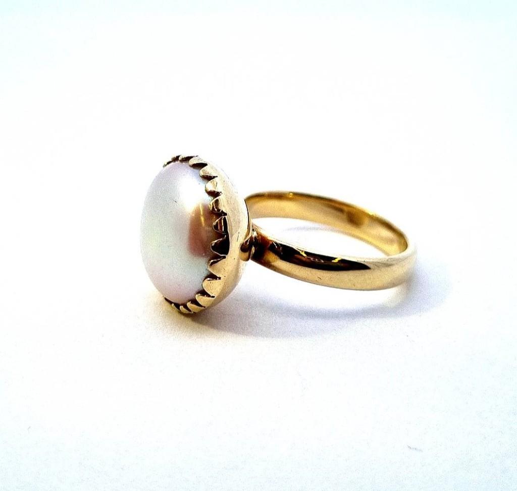 Zlatý prsten o ryzosti 585/1000, punc labuť. Velikost 56, váha 8,81 g, průměr perly 16 mm.