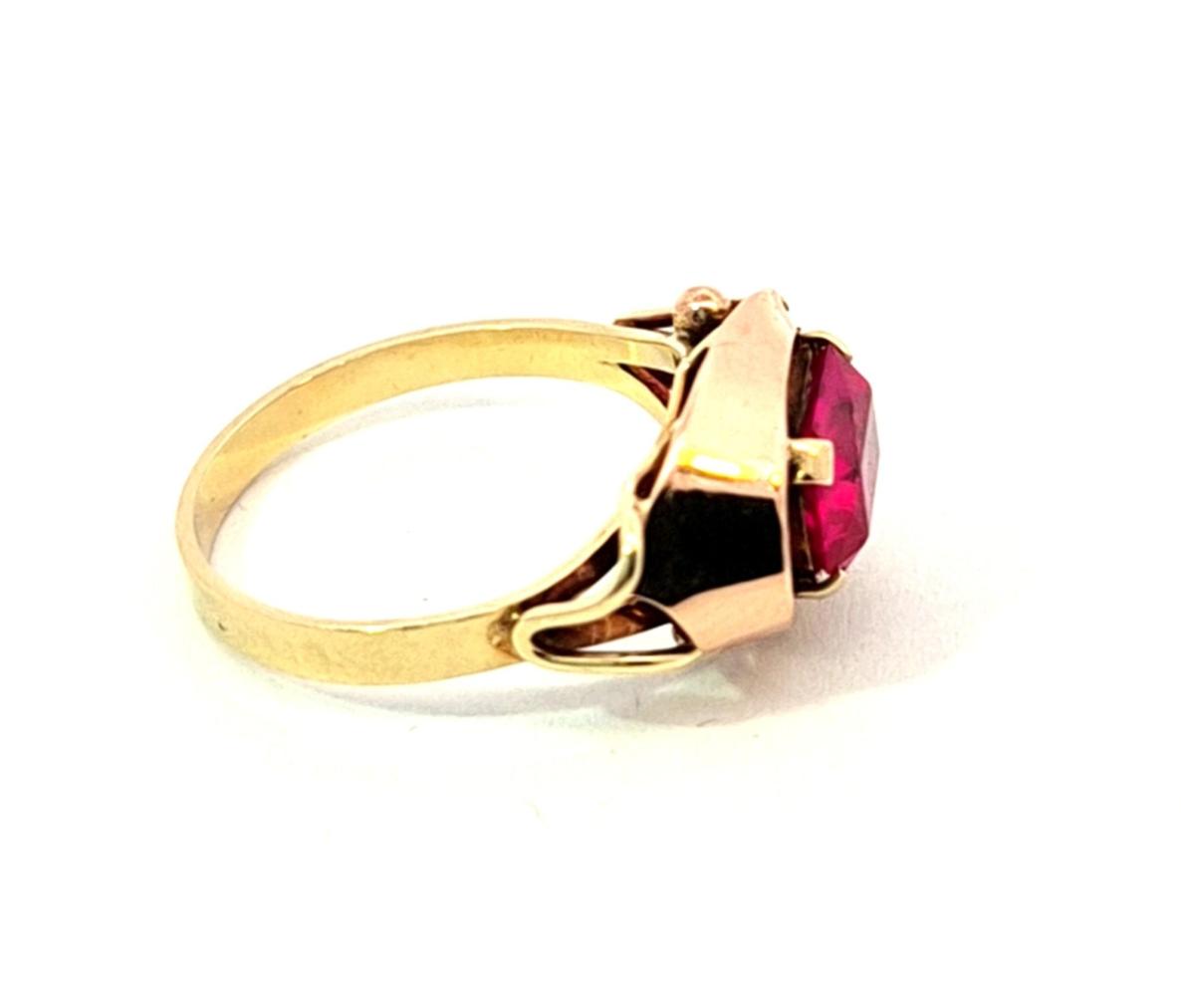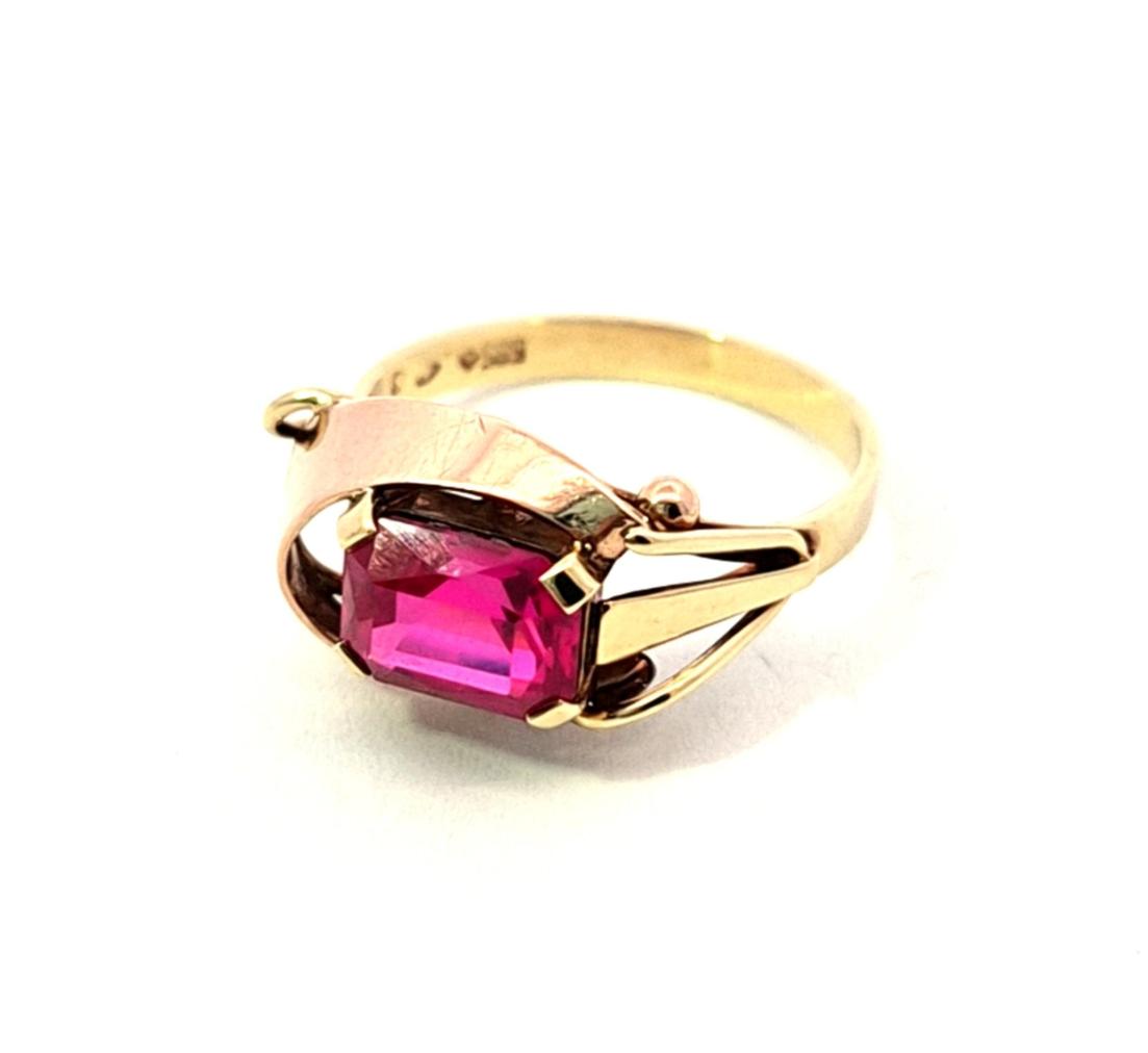 Prsten z kombinace žlutého a růžového zlata o ryzosti 585/1000, punc čejka. Velikost 55, váha 3,30 g, v nejširším bodě 11 mm. Kámen je syntetický.