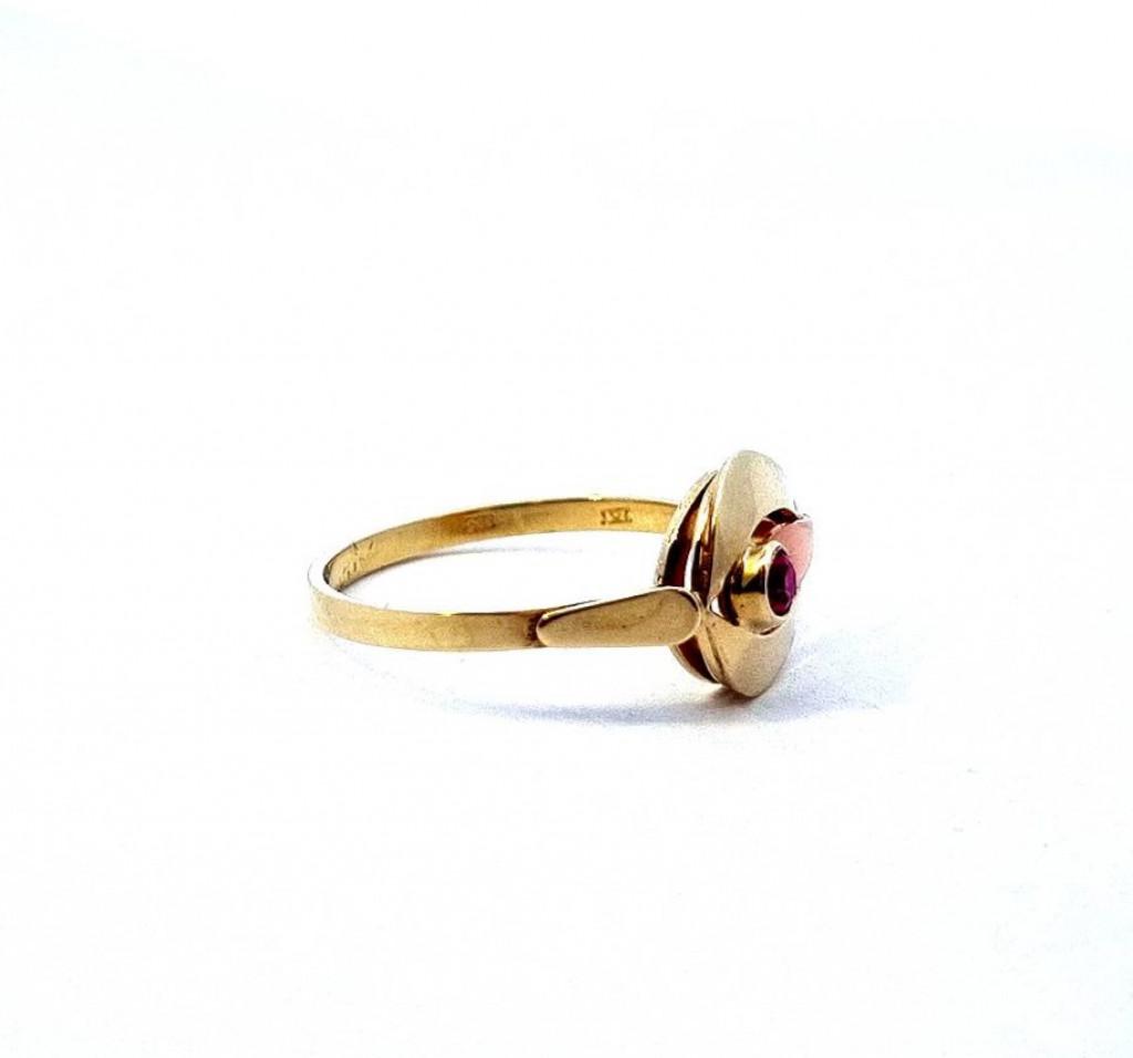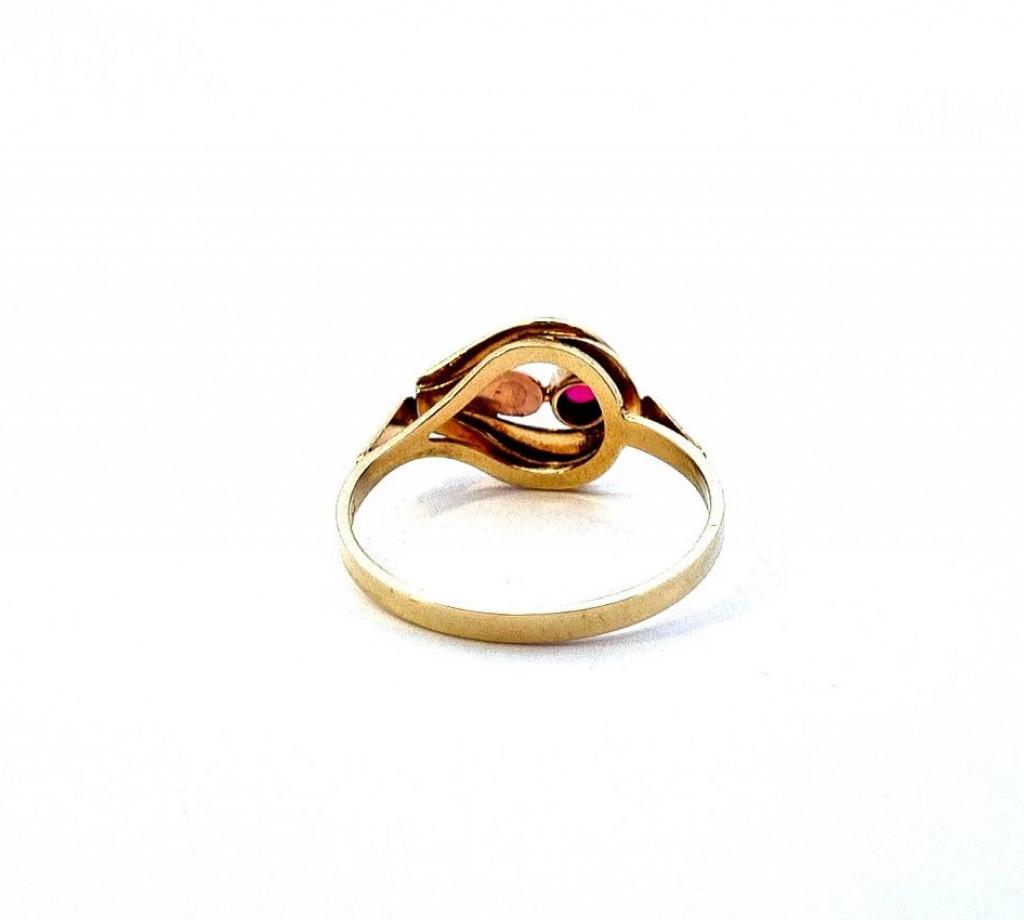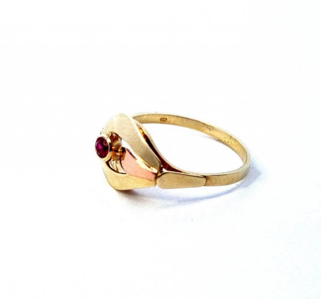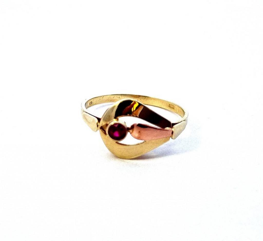 Prsten z kombinace žlutého a růžového zlata o ryzosti 585/1000, punc labuť. Velikost 58,5, váha 2,35 g, v nejširším bodě 11 mm. Kámen je syntetický.