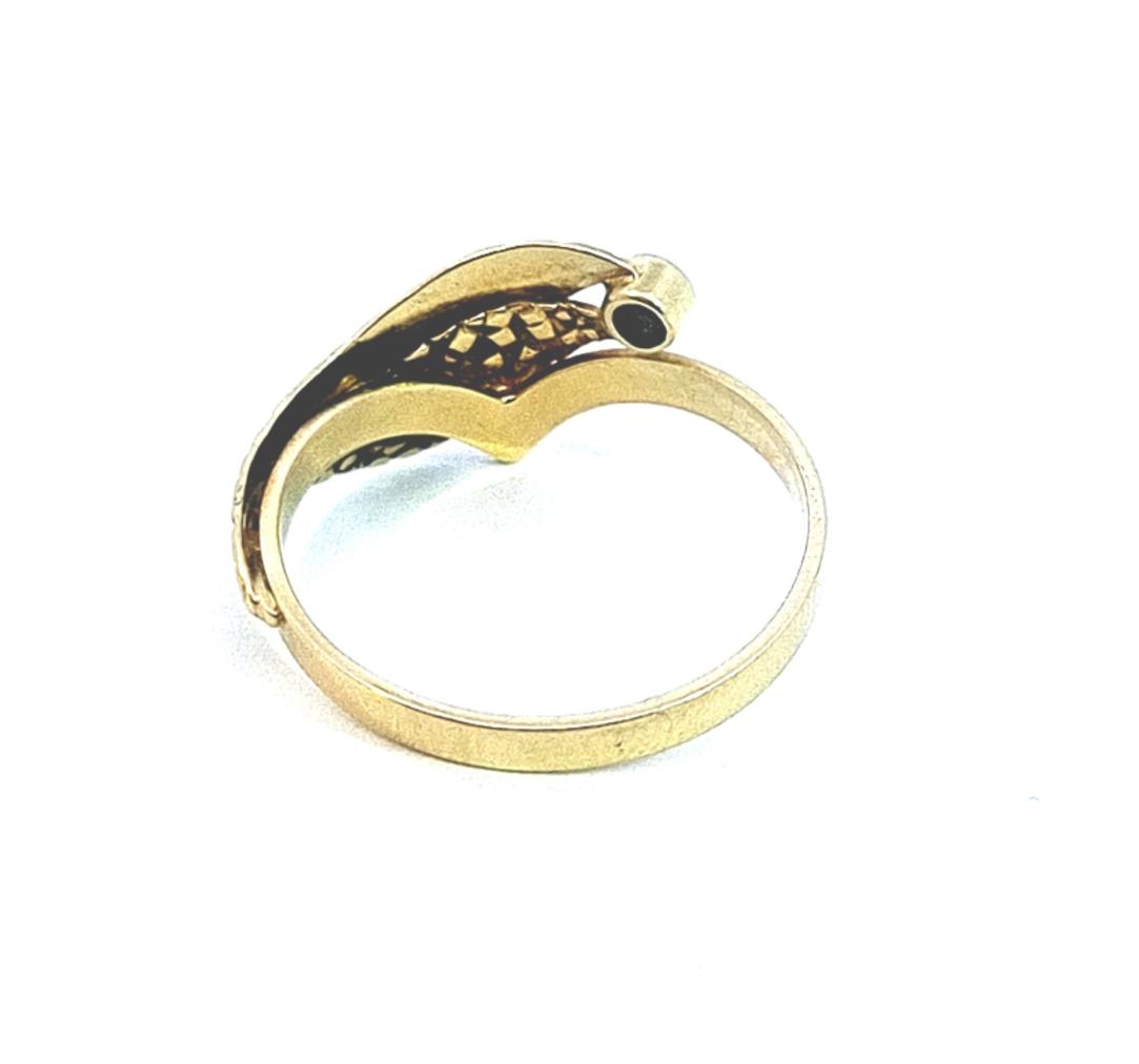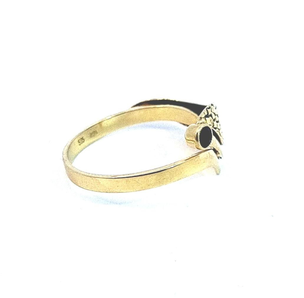 Zlatý prsten o ryzosti 585/1000, punc labuť. Váha 2,73 g, velikost 59, v nejširším bodě 10,5 mm, průměr kamene 3 mm. Kámen je syntetický.