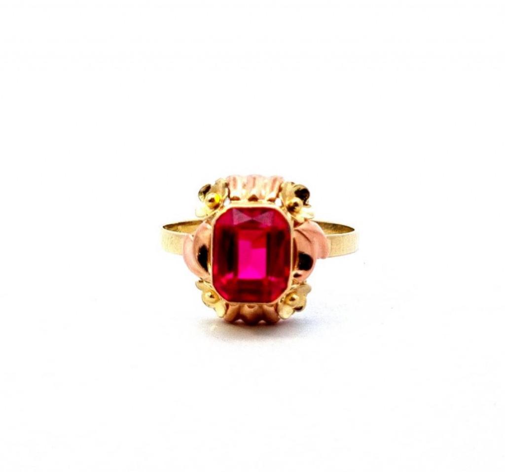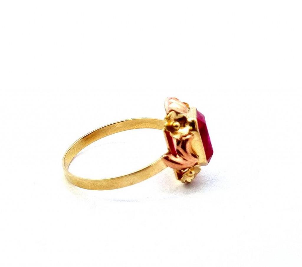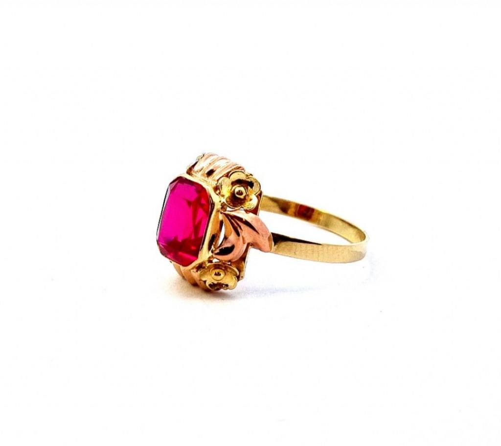 Zlatý prsten z kombinace žlutého a růžového zlata o ryzosti 585/1000, punc čejka, váha 3,65 g, velikost 66, v nejširším bodě 16 mm. Kámen je syntetický.