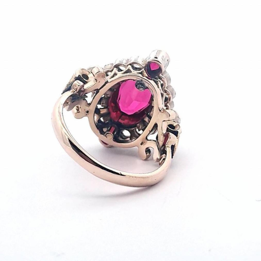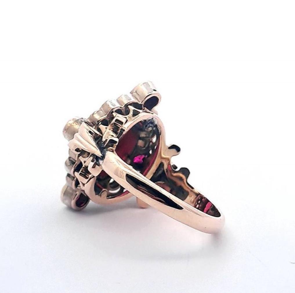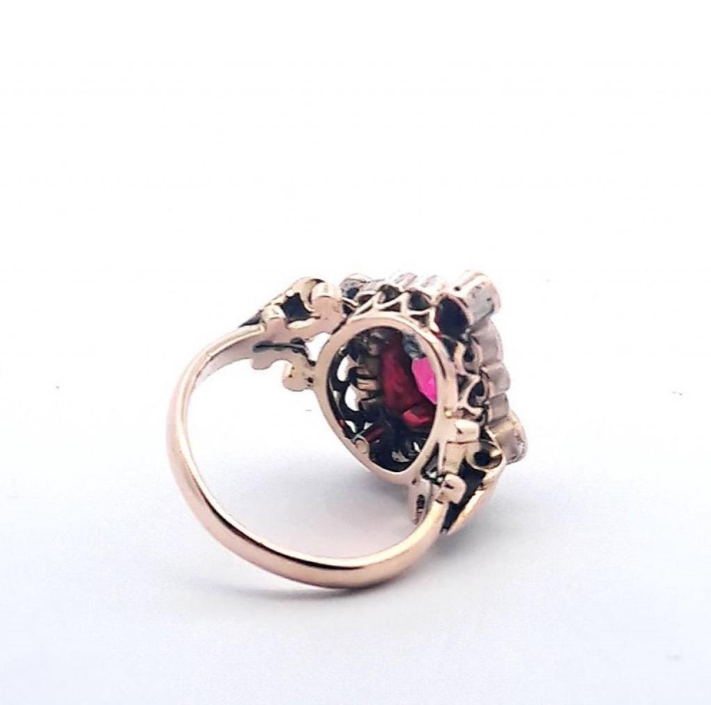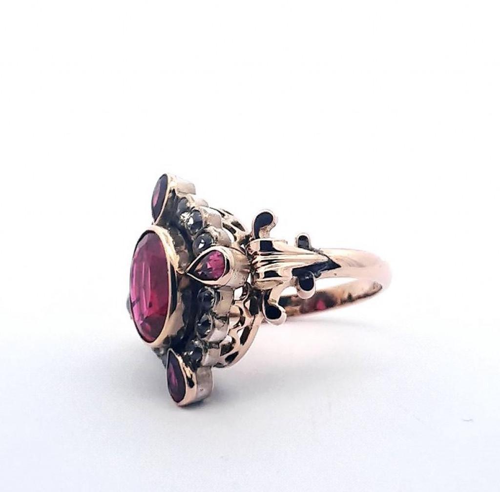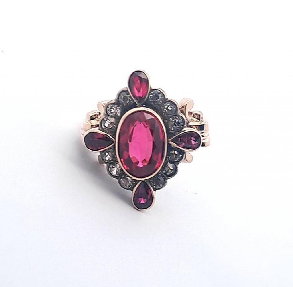 Zlatý prsten o ryzosti 585/1000, punc čejka. Velikost 57,5, váha 10,15 g, rozměr hlavy prstenu 24 x 20 mm, rozměr centrálního kamene 12 x 8,5 mm. Kameny jsou syntetické.