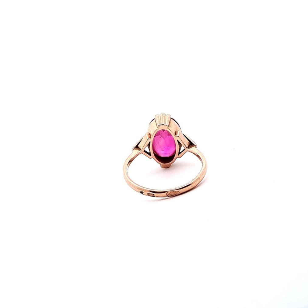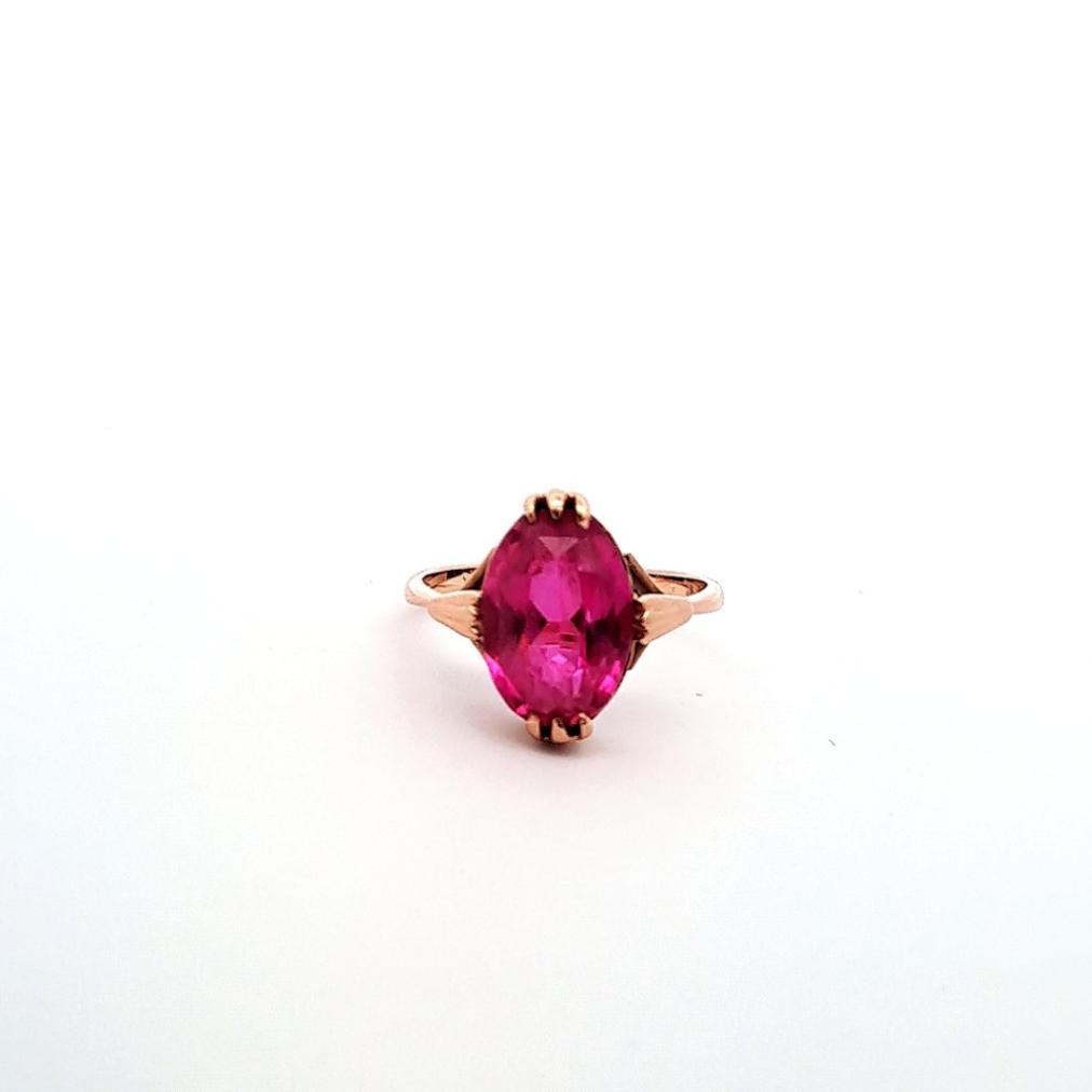 Zlatý prsten s růžovým kamenem. Ryzost 585/1000, punc labuť. Váha 4,96 g, vel. 57, rozměry kamene 16 x 9 mm. Kámen je syntetický.