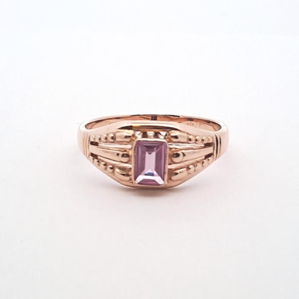 Zlatý prsten, vel. 62, ryzost 585/1000, punc labuť. Váha 4,80 g, šířka v nejširším bodě 10 mm.