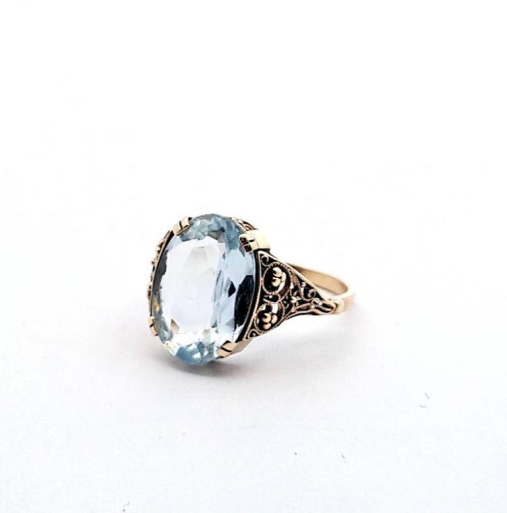 Zlatý prsten s velkým, světle modrým kamenem. Zlato o ryzosti 585/1000 s puncem labuť. Váha prstenu je 2,91 g, velikost 52. Rozměry ozdobné části prstenu jsou 14 x 18 mm. Rozměry modrého kamene jsou 14 x 10 mm. Kámen je syntetický.