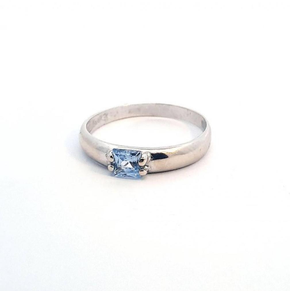 Prsten z bílého zlata o ryzosti 585/1000, punc labuť. Velikost 54, váha 1,51 g, v nejširším bodě 4 mm. Kámen je syntetický.