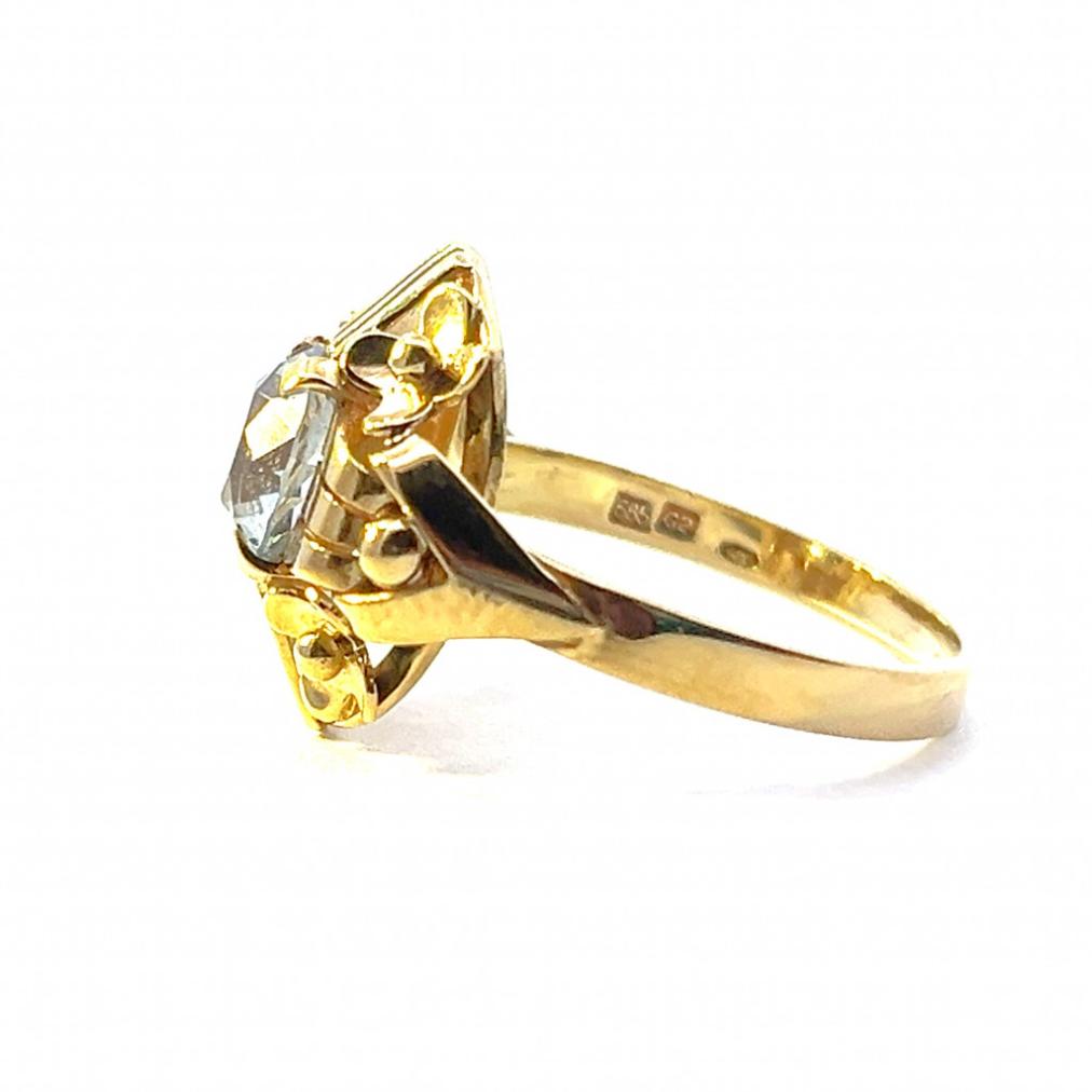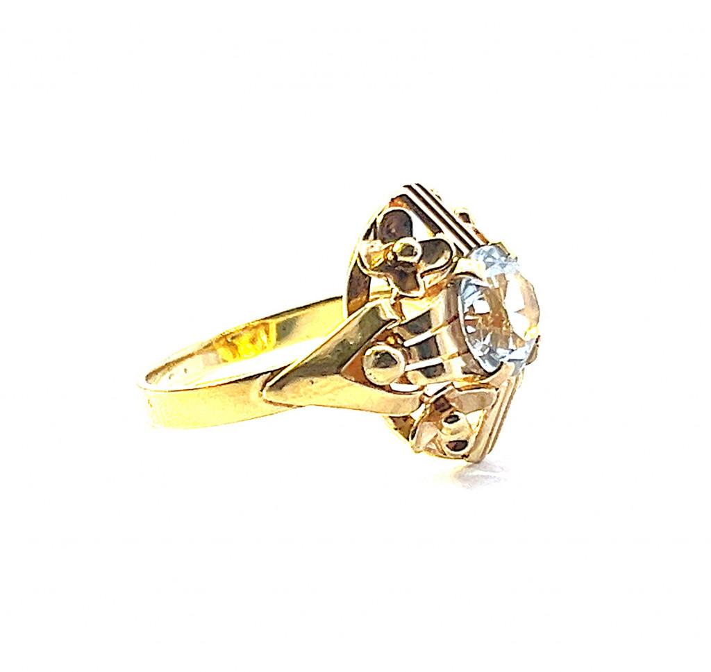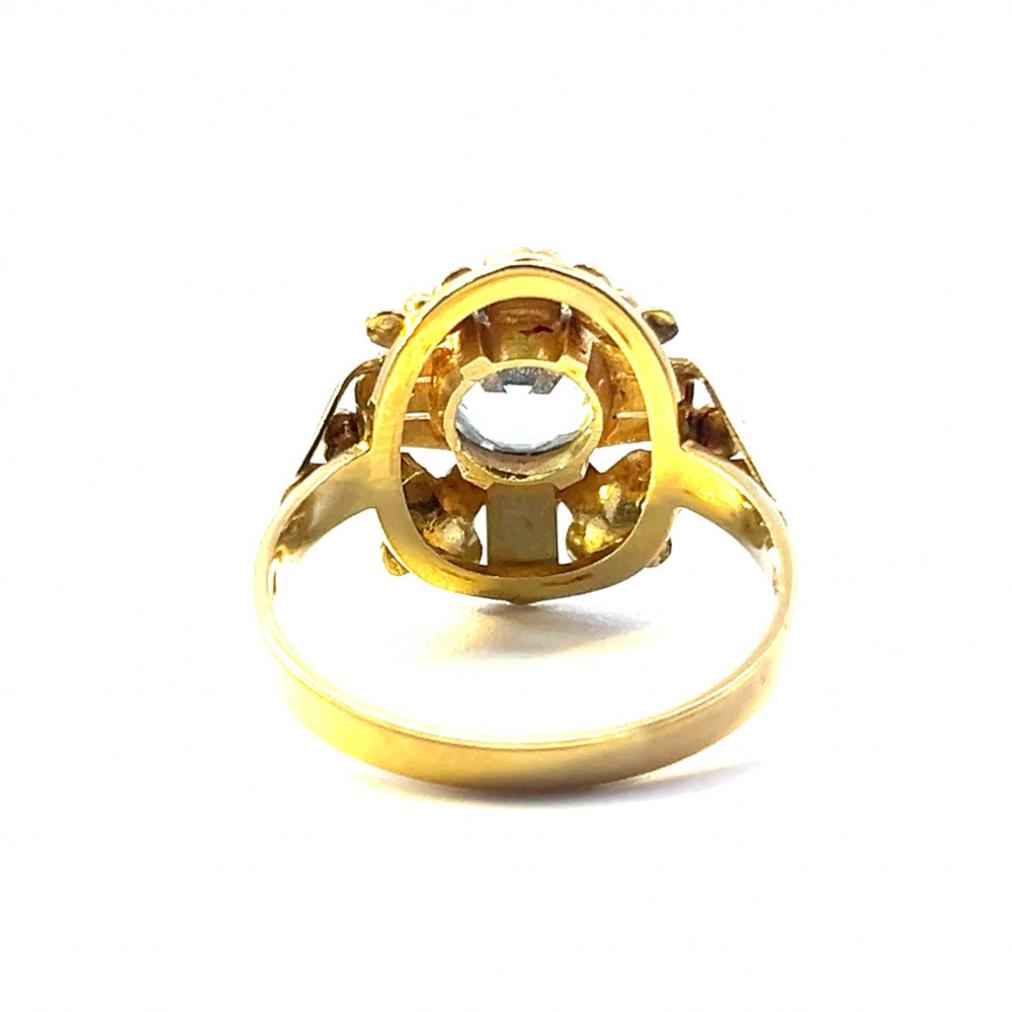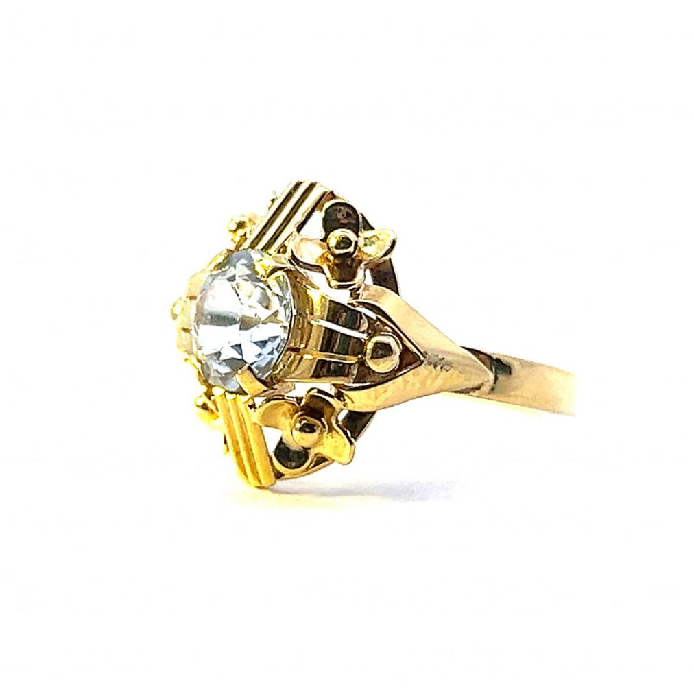 Zlatý zdobený prsten s modrým kamenem o ryzosti 585/1000 s puncem čejka. Velikost 55, váha 3,54 g, rozměry hlavy prstenu jsou 16 x 16 mm, průměr kamene je 7 mm. Kámen je syntetický.