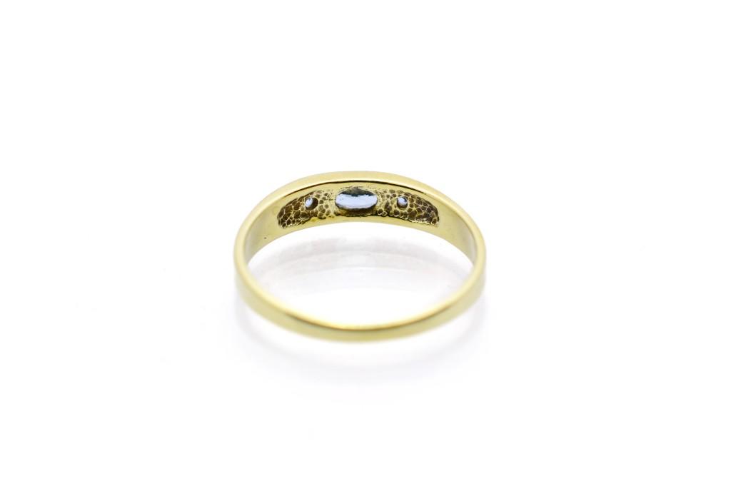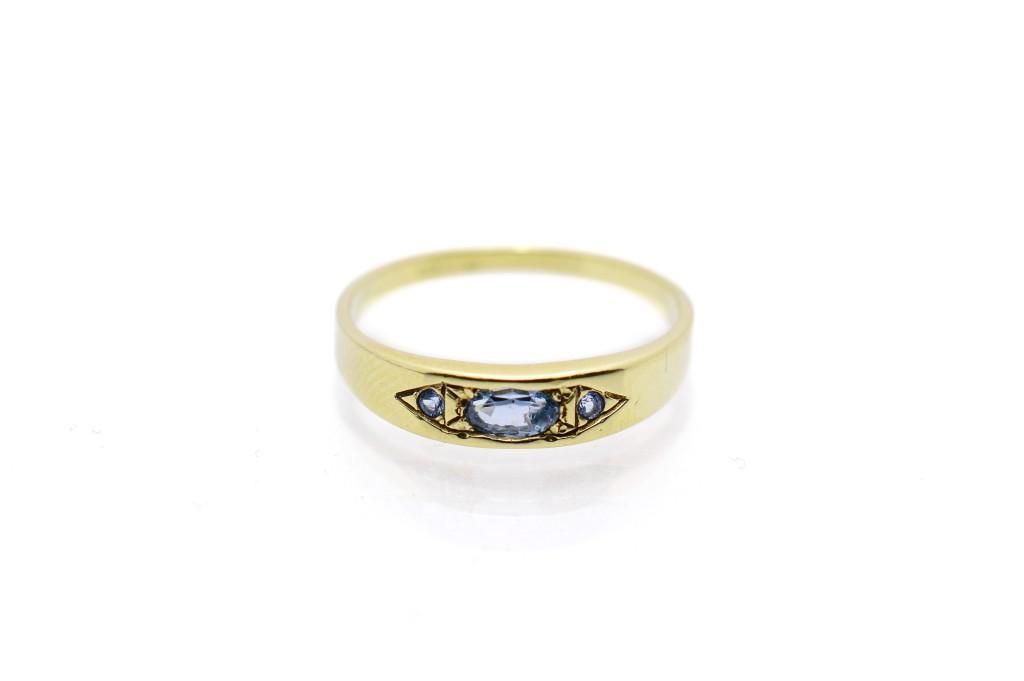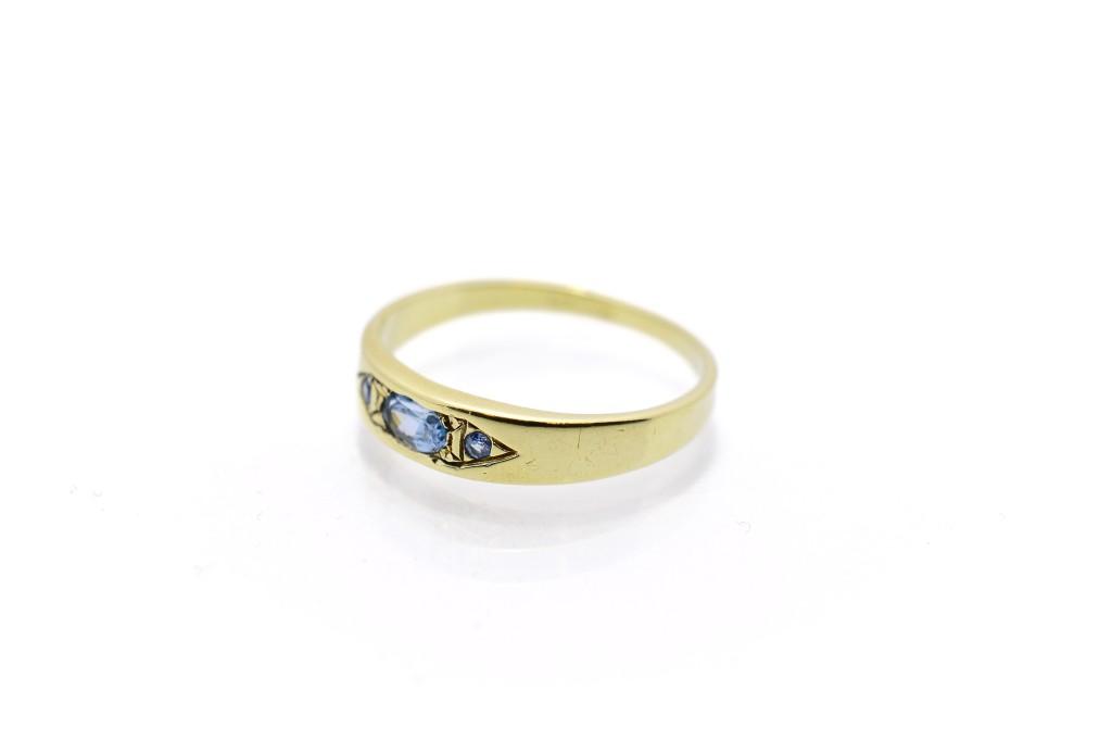 Zlatý prsten s topazy, vel. 55, ryzost 585/1000, punc labuť, váha 2,42 g, v nejširším bodě 4 mm, kameny jsou syntetické.