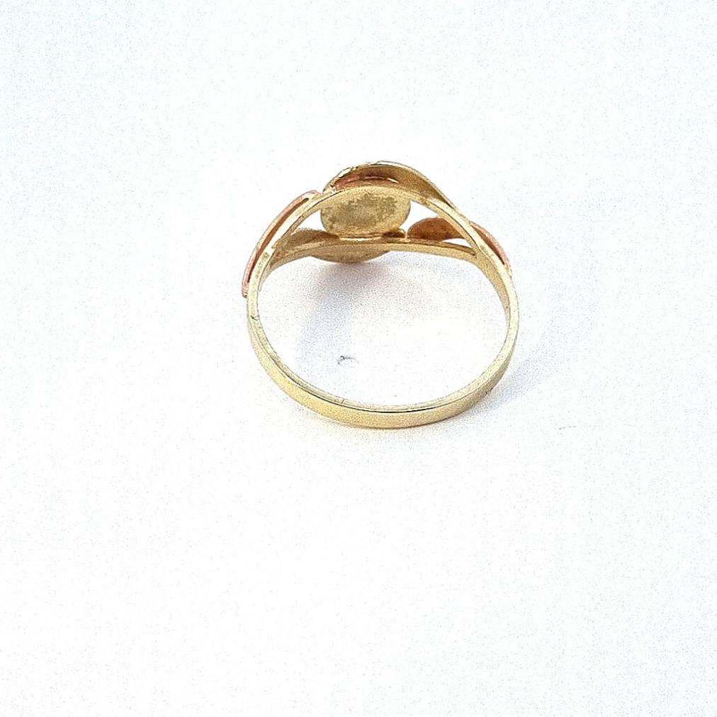 Zlatý prsten o ryzosti 585/1000, punc labuť, váha 2,07 g, velikost 56, v nejširším bodě 11 mm, průměr kamene 5 mm.