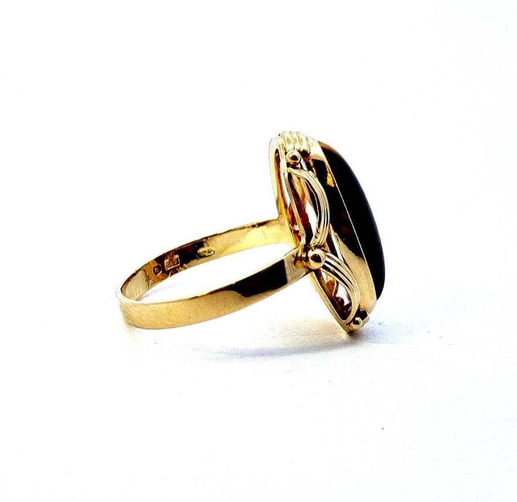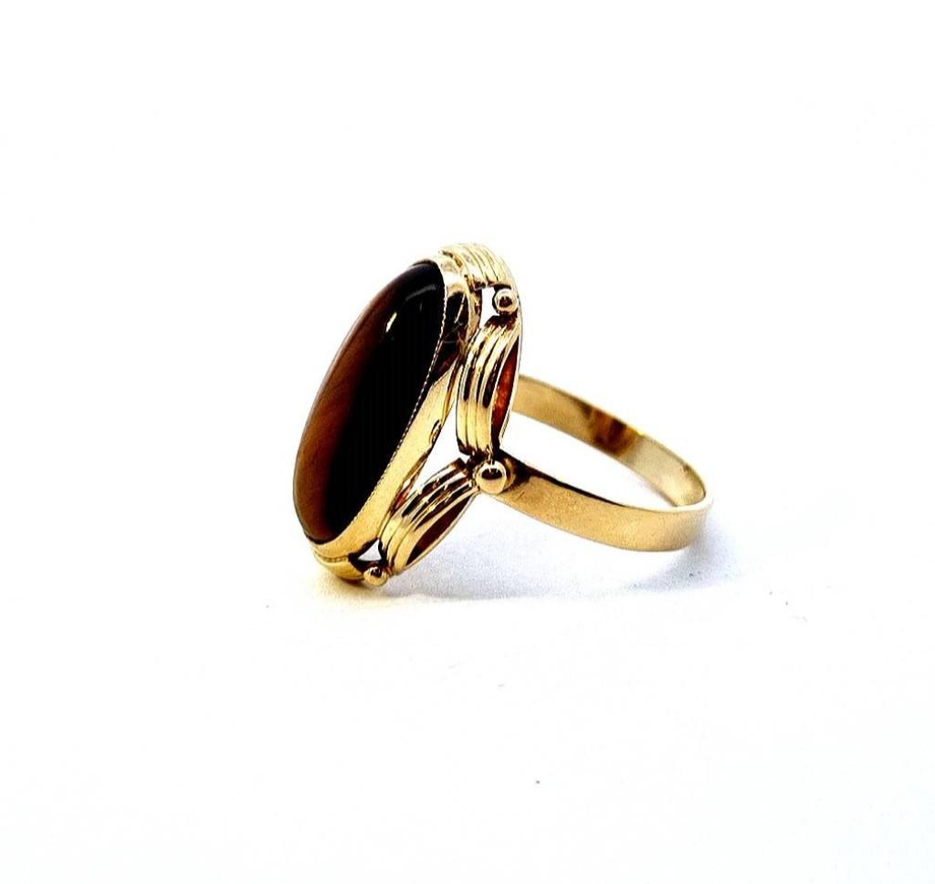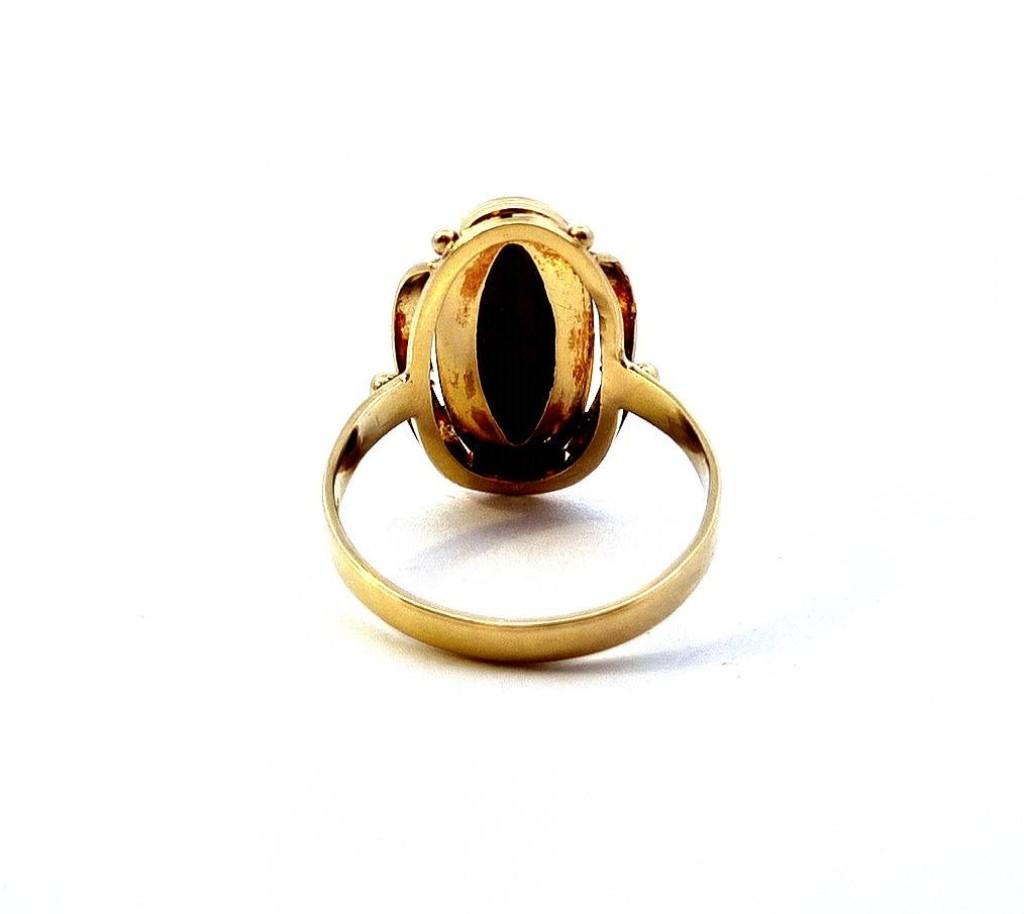 Zlatý prsten o ryzosti 585/1000, punc čejka. Velikost 58, váha 4,39 g, rozměr kamene 19 x 8 mm, rozměr hlavy prstenu 21 x 15 mm.