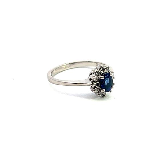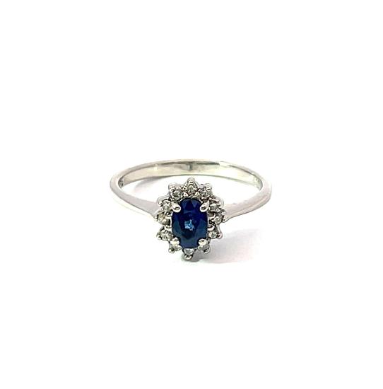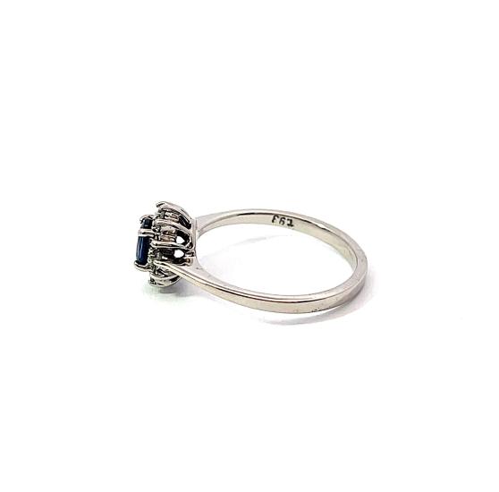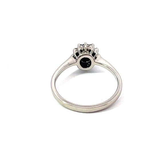 Prsten z bílého zlata o ryzosti 750/1000, punc kohout. Velikost 54, váha 3,34 g, rozměr hlavy prstenu 9,5 x 8 mm. Kámen - syntetický safír - 1 ks. Kámen - přírodní diamant briliantového brusu - 12 ks, každý cca 0,01 ct - dohromady cca 0,12 ct.