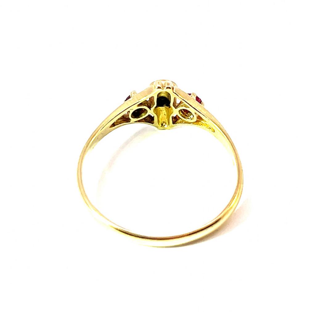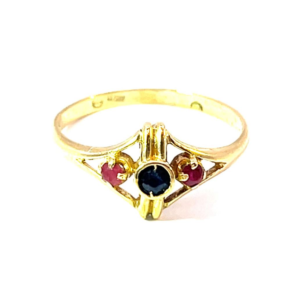 Zajímavý zlatý prsten zdobený safírem a dvěma rubíny. Ryzost 585/1000 s puncem labuť. Váha 1,80 g. Rozměry ozdobné části jsou 9 x 10 mm. Kameny jsou syntetické.