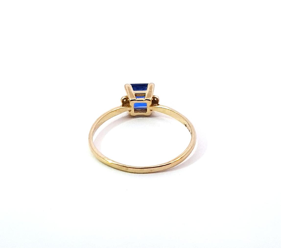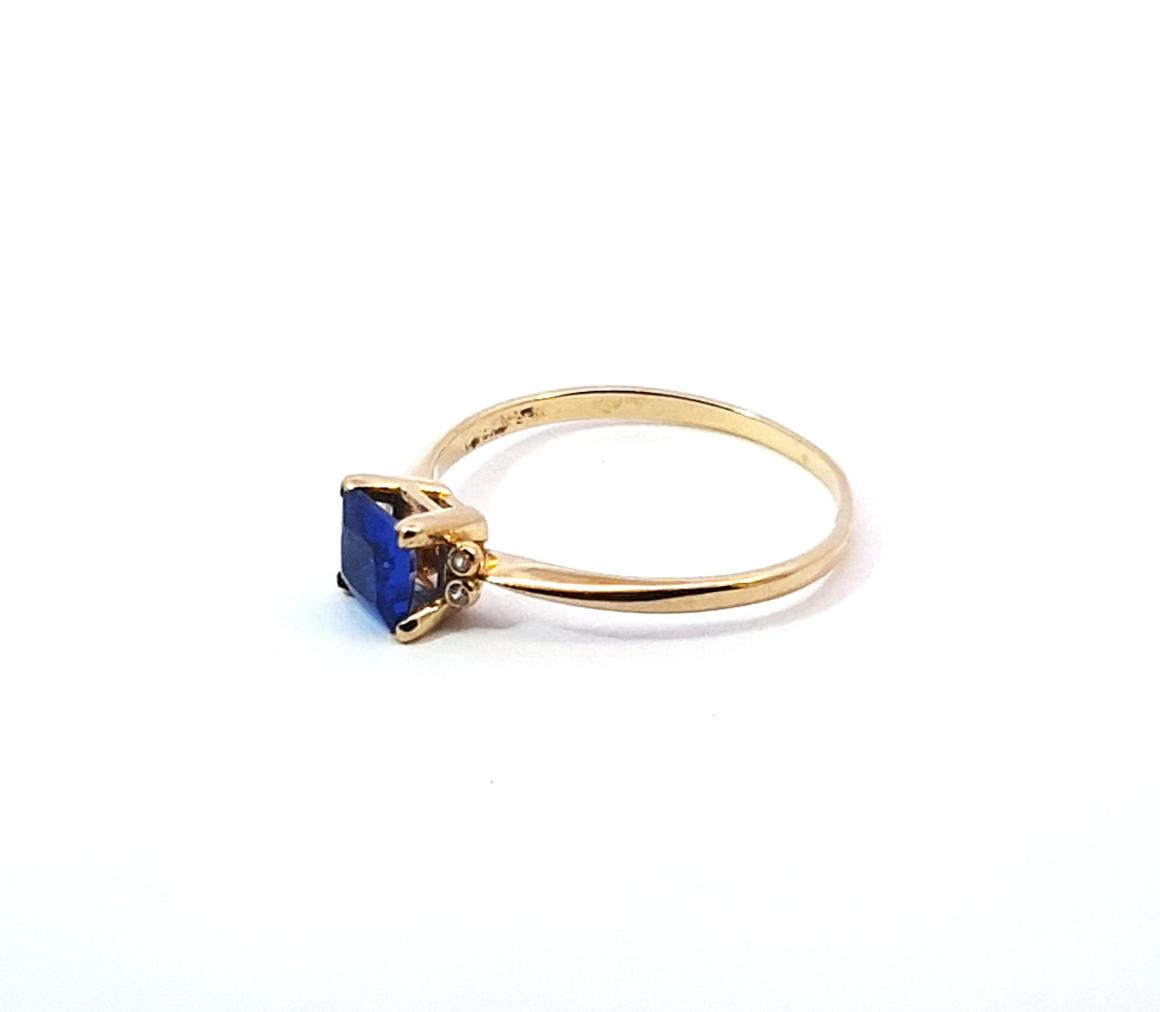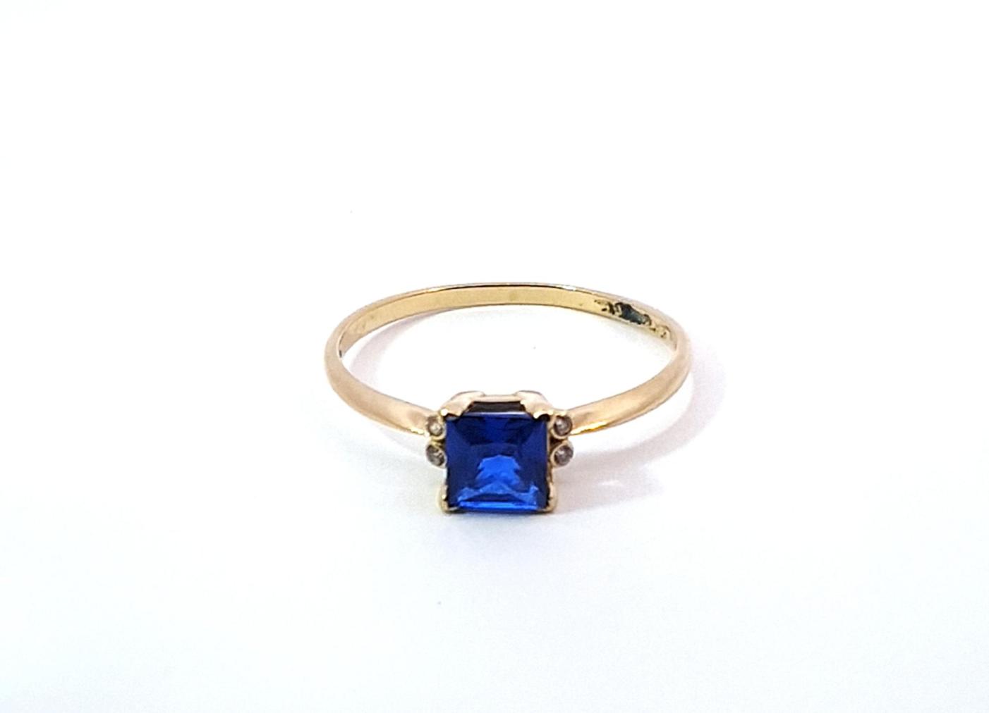 Zlatý prsten o ryzosti 585/1000, punc labuť. Velikost 56, váha 1,45 g, rozměr hlavy prstenu 7 x 5 mm. Kameny jsou syntetické.