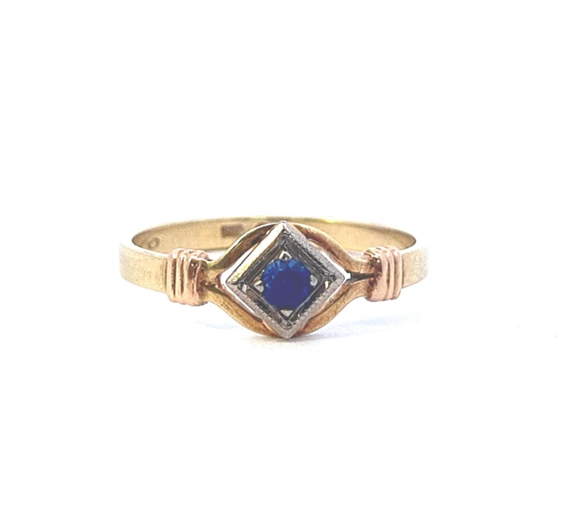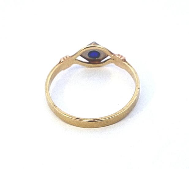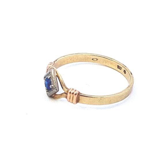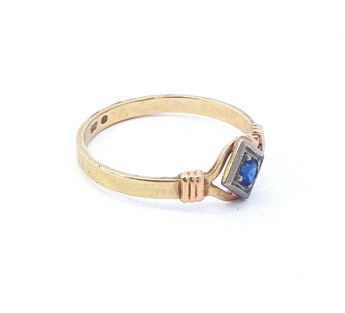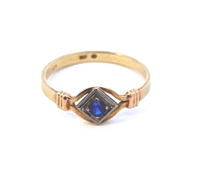 Prsten z kombinace bílého, žlutého a růžového zlata o ryzosti 585/1000, punc čejka. Velikost 56, váha 1,94 g, v nejširším bodě 7 mm. Kámen je syntetický.