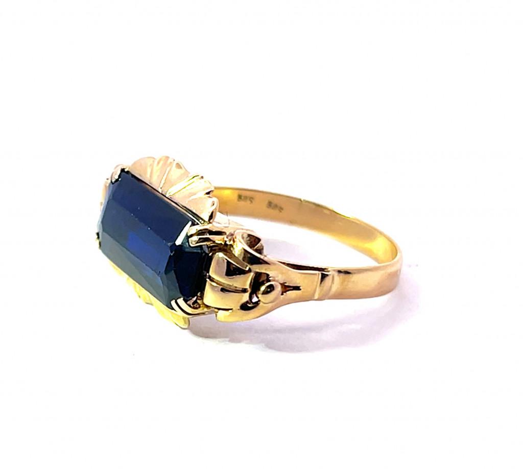 Zlatý prsten o ryzosti 585/1000, punc labuť. Velikost 58, váha 4,25 g, v nejširším bodě 12 mm, rozměr kamene 15 x7 mm. Kámen je syntetický a má oťuky shora i ze spodní strany.