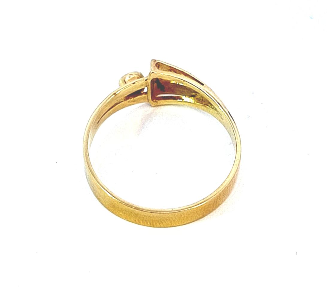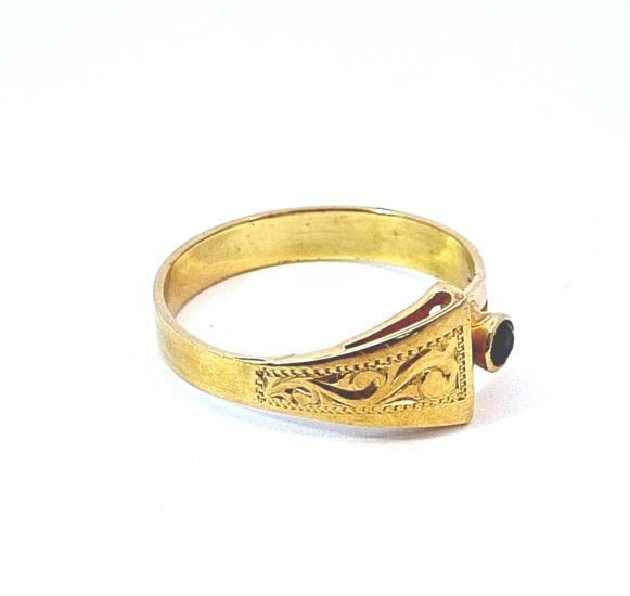 Zlatý prsten o ryzosti 585/1000, punc labuť. Váha 2,95 g, velikost 59, v nejširším bodě 8,5 mm. Kámen je syntetický.