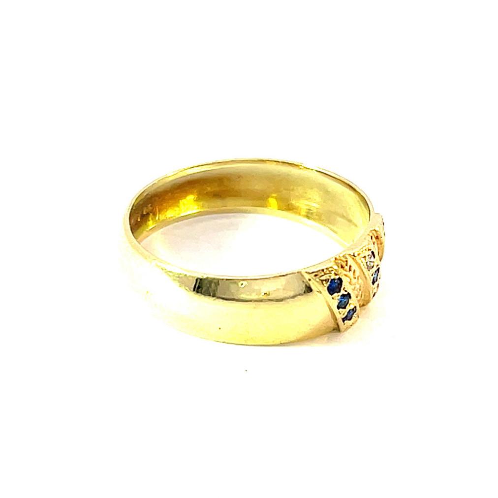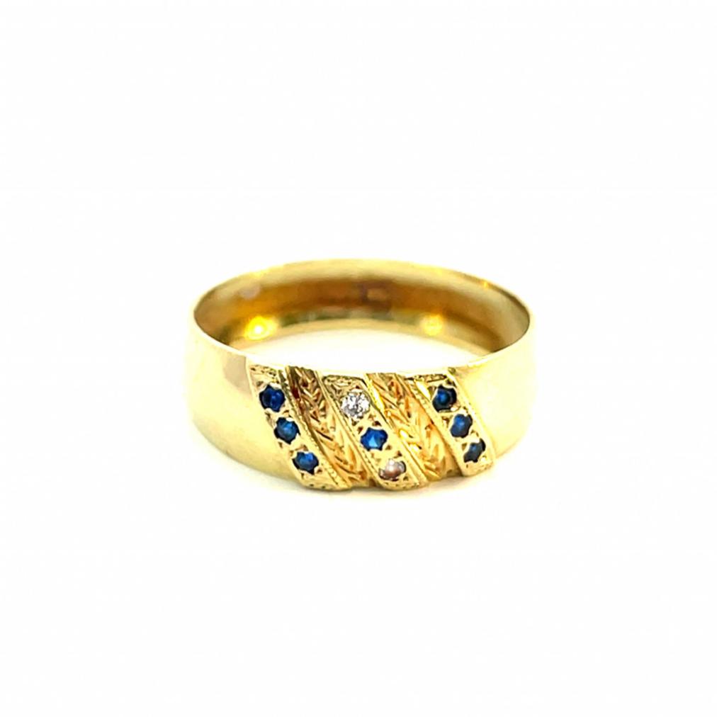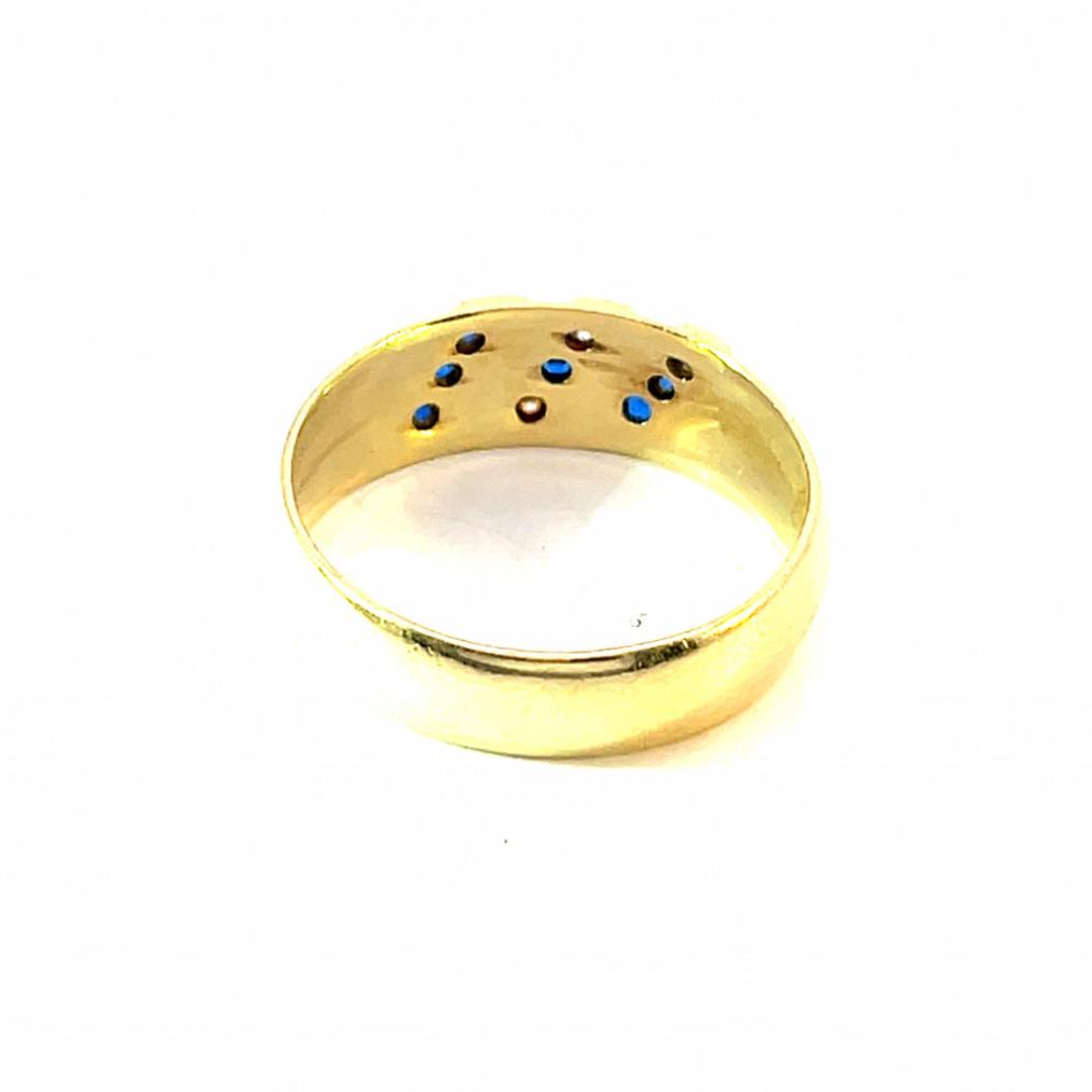 Zlatý prsten o ryzosti 585/1000, punc labuť. Velikost 60, váha 3,12 g, v nejširším bodě 9 mm. Kameny jsou syntetické.