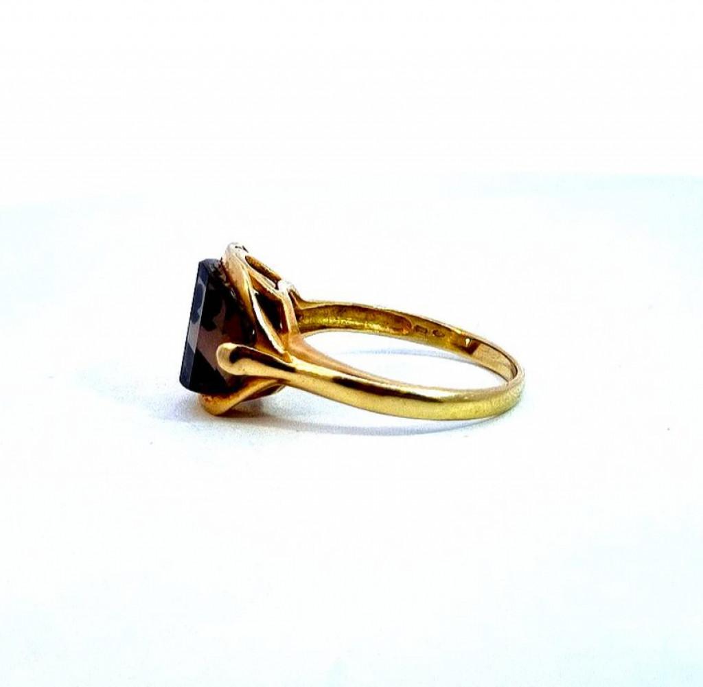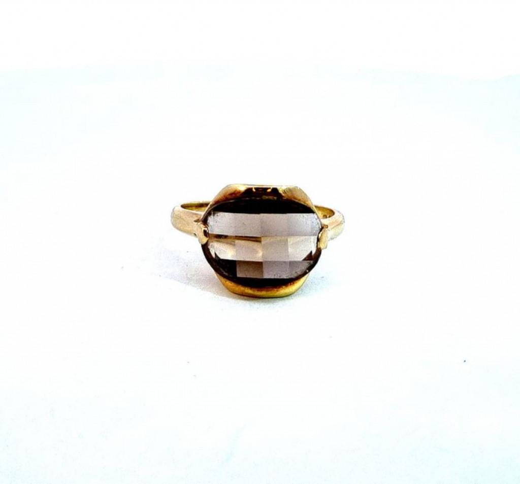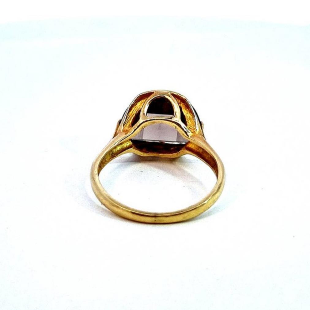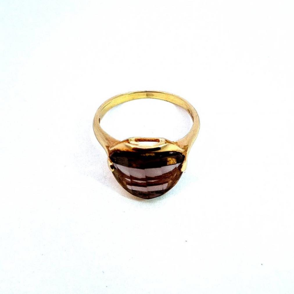 Zlatý prsten o ryzosti 585/1000, punc labuť. Velikost 58, váha 4,24 g, v nejširším bodě 12 mm. Kámen - přírodní záhněda.