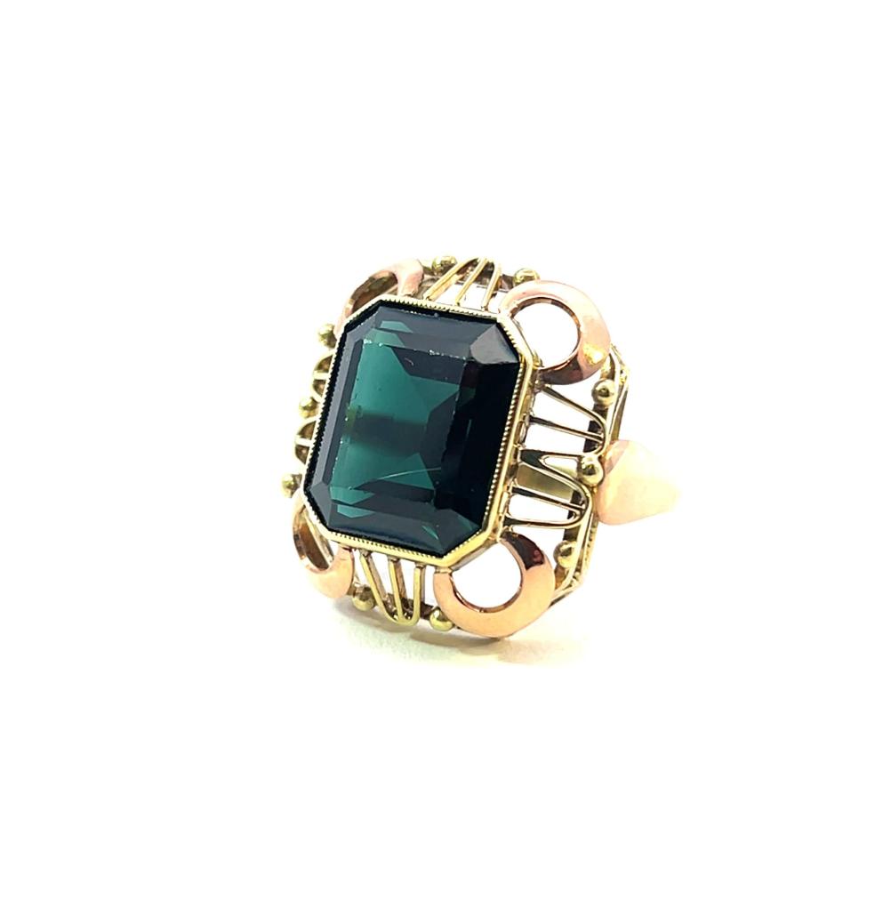 Prsten z kombinace žlutého a růžového zlata o ryzosti 585/1000, punc čejka. Velikost 54, váha 6,34 g, rozměr hlavy prstenu 19 x 20 mm. Kámen je syntetický a lehce kloktá.