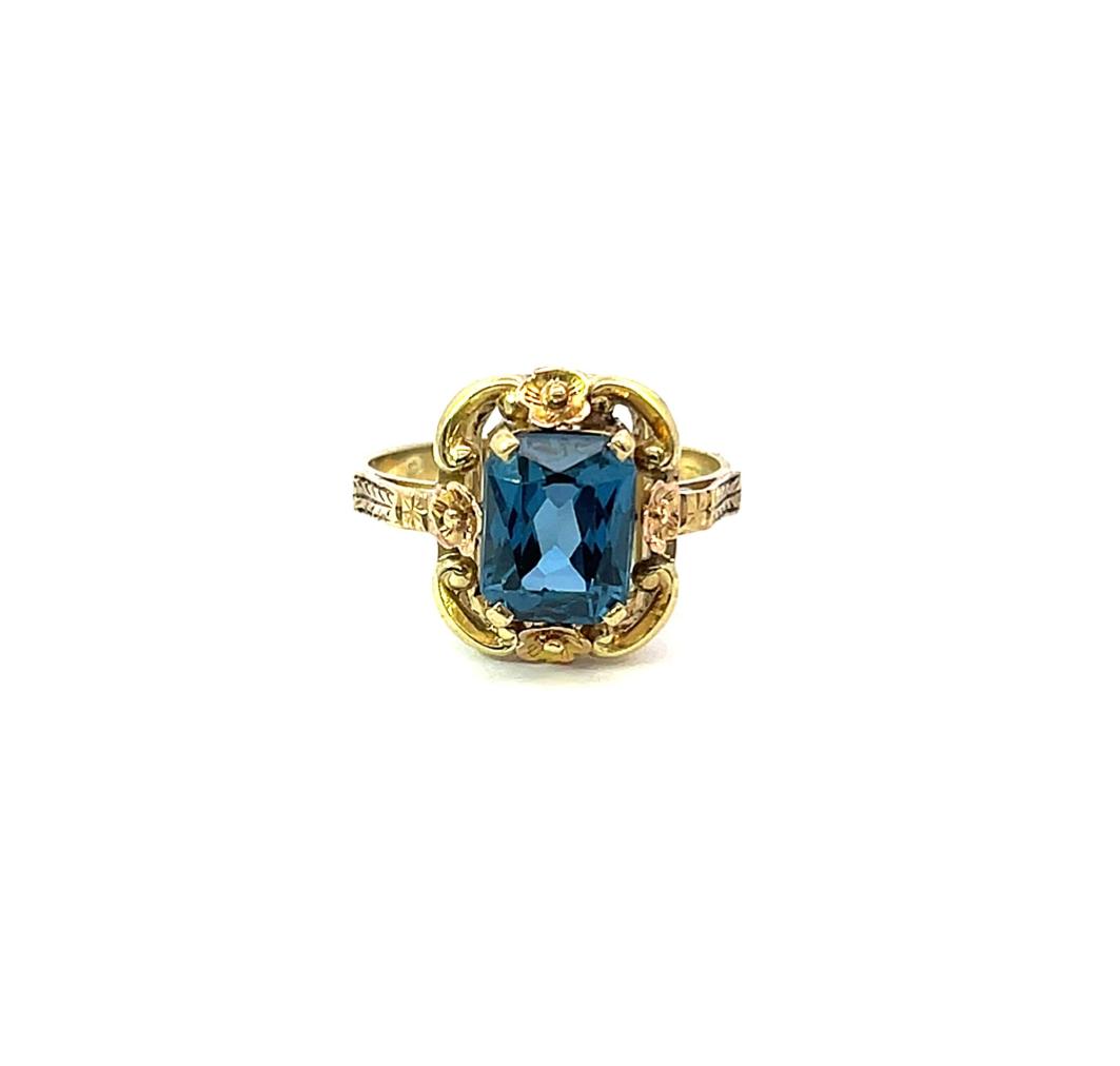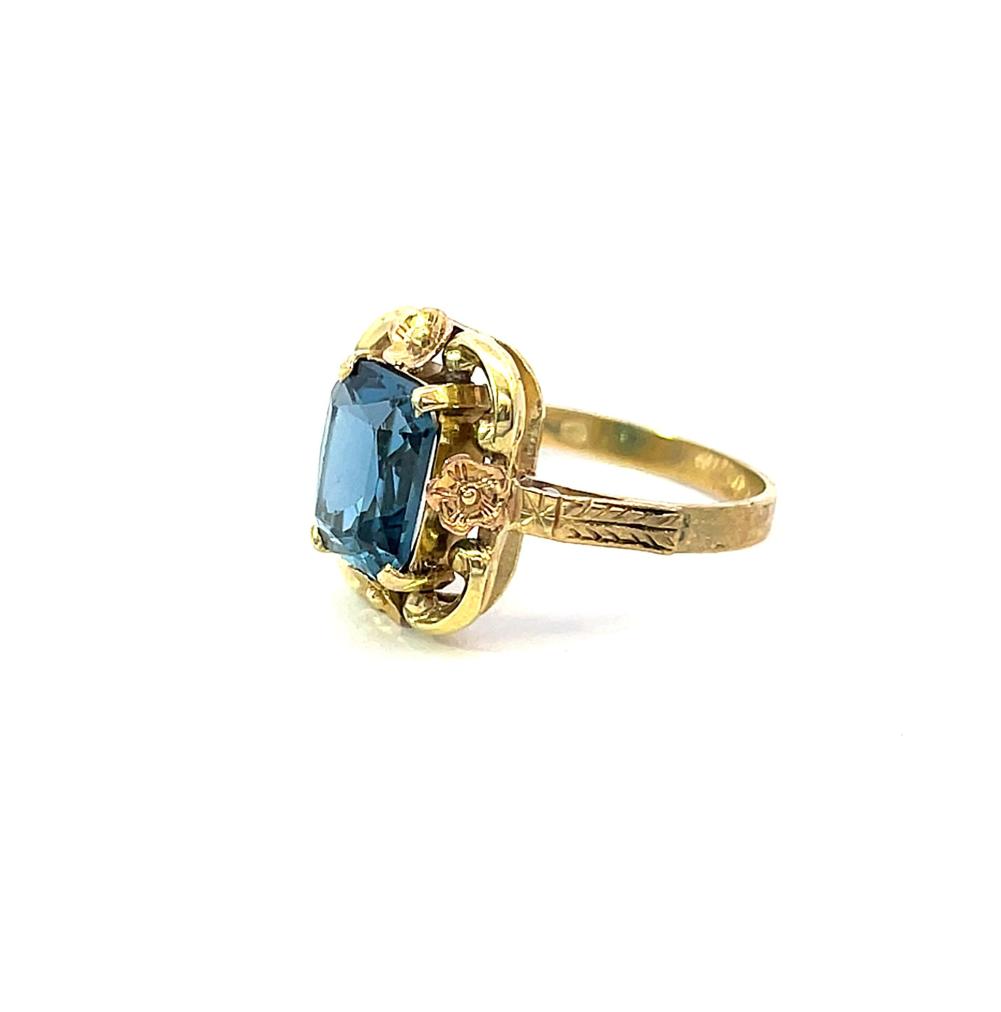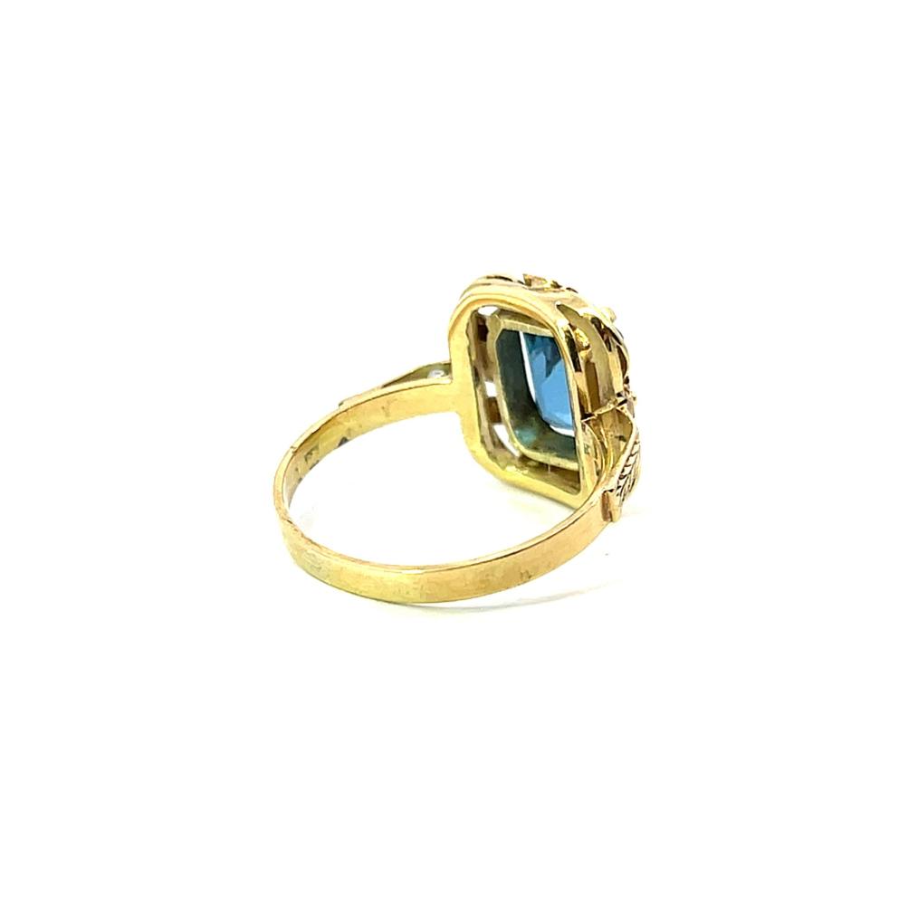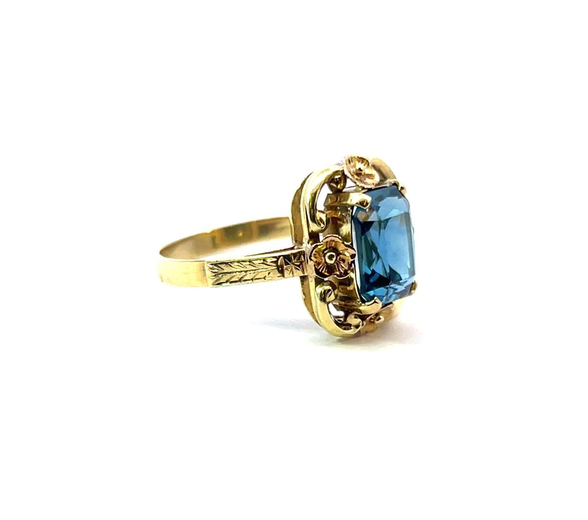 Prsten z kombinace žlutého a růžového zlata o ryzosti 585/1000, punc čejka. Váha 2,47 g, velikost 55, rozměr hlavy prstenu 11 x 12 mm. Kámen je syntetický.