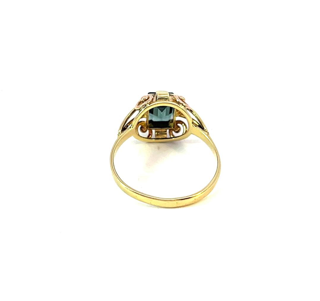 Prsten z kombinace žlutého a růžového zlata o ryzosti 585/1000, punc čejka. Váha 2,47 g, velikost 55, rozměr hlavy prstenu 12 x 11,5 mm. Kámen je syntetický, nese známky opotřebení.