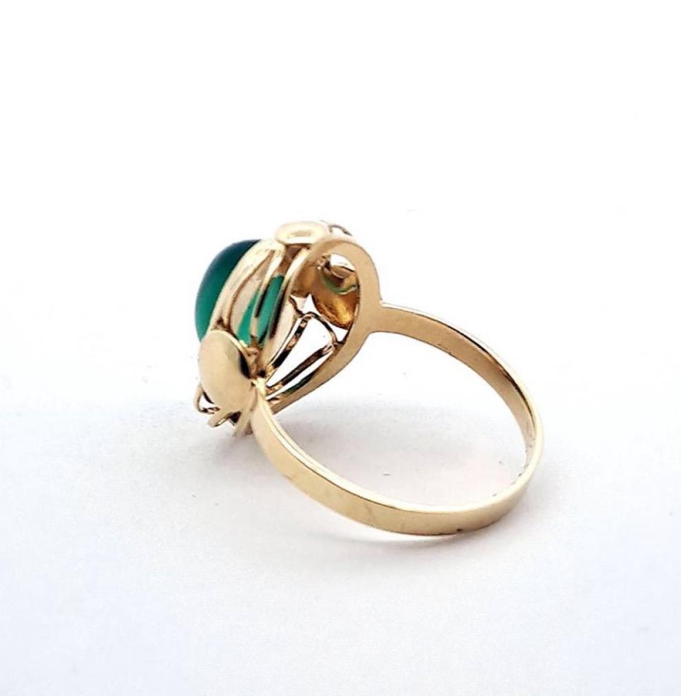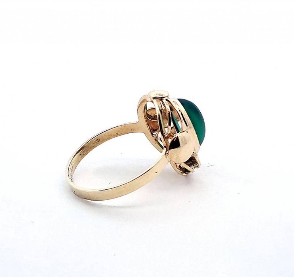 Zajímavý zlatý prsten se zeleným kamenem, o ryzosti 585/1000 s puncem čejka. Váha prstenu 4,24 g, velikost 62. Velikost hlavy prstenu je 19 x 16 mm. Rozměry kamene jsou 8 x 11 mm. Kámen je syntetický.