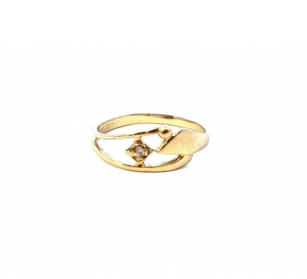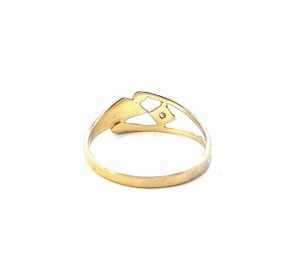 Zlatý prsten o ryzosti 585/1000, punc labuť. Velikost 51, váha 1,40 g, v nejširším bodě 7 mm.