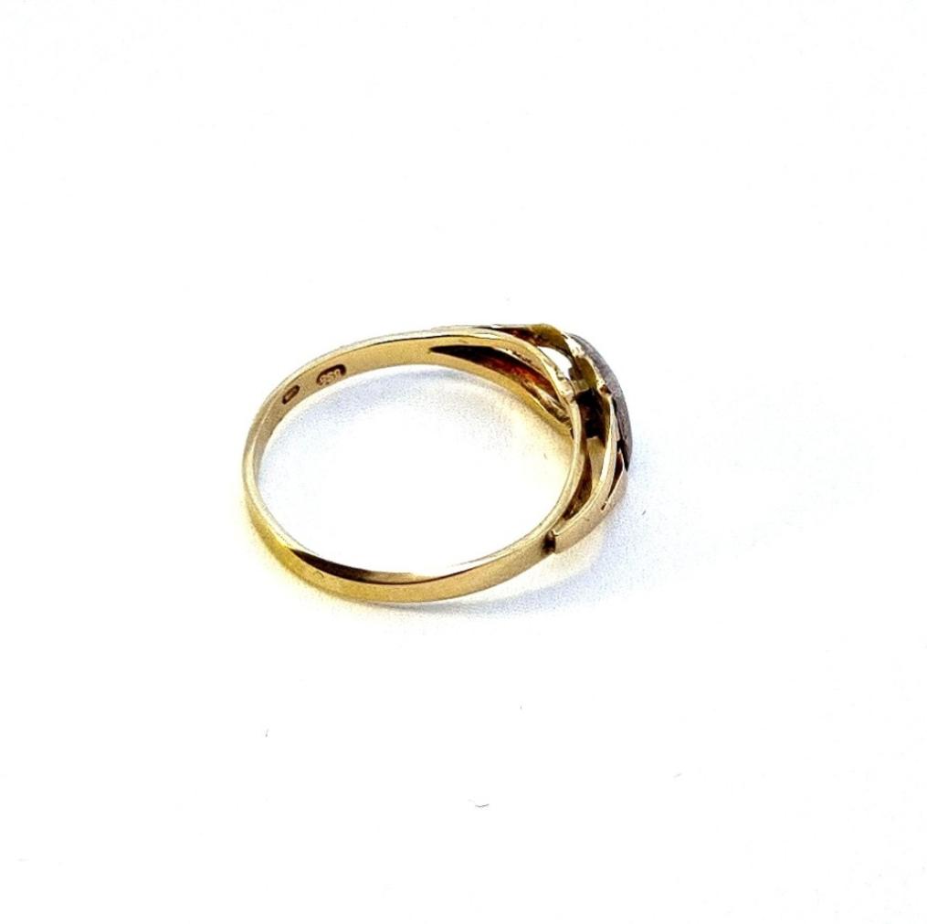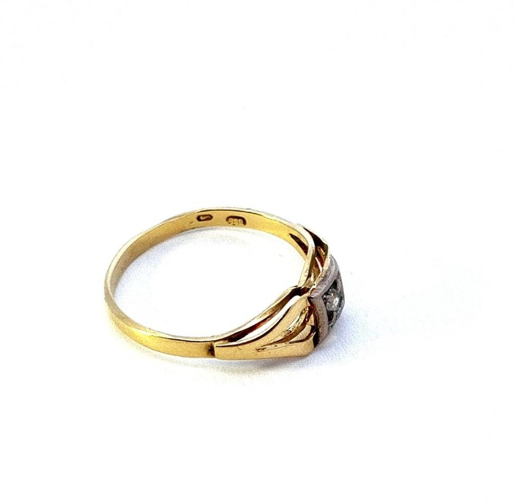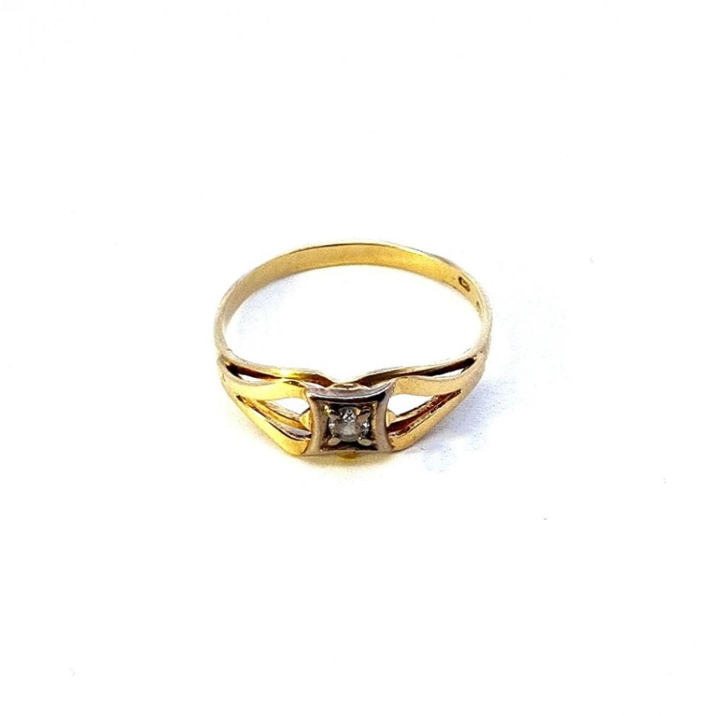 Zlatý prsten o ryzosti 585/1000, punc labuť. Velikost 51, váha 1,47 g, šířka v nejširším bodě 6 mm. Kámen je syntetický.