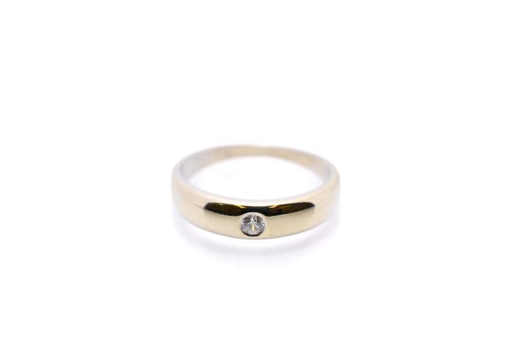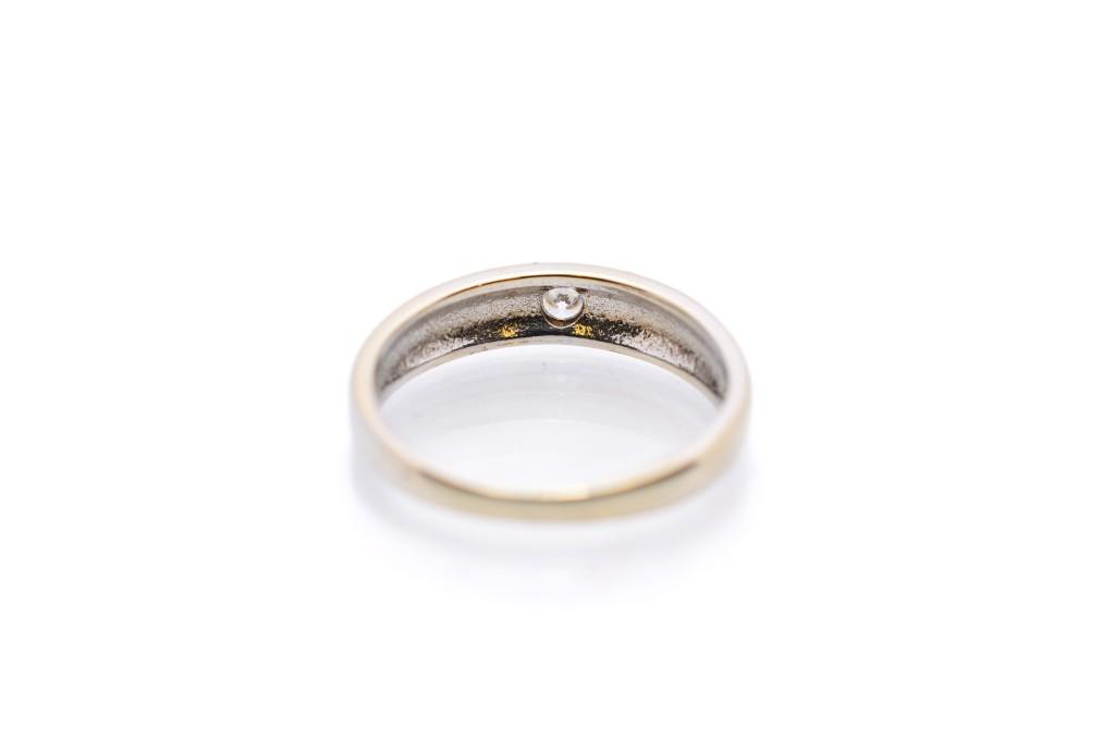 Zlatý prsten o ryzosti 585/1000, punc labuť, váha 3,02 g, velikost 53, v nejširším bodě 4 mm.