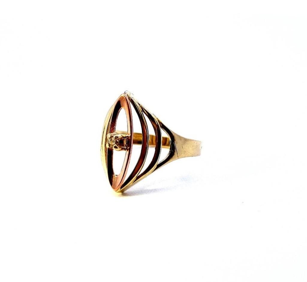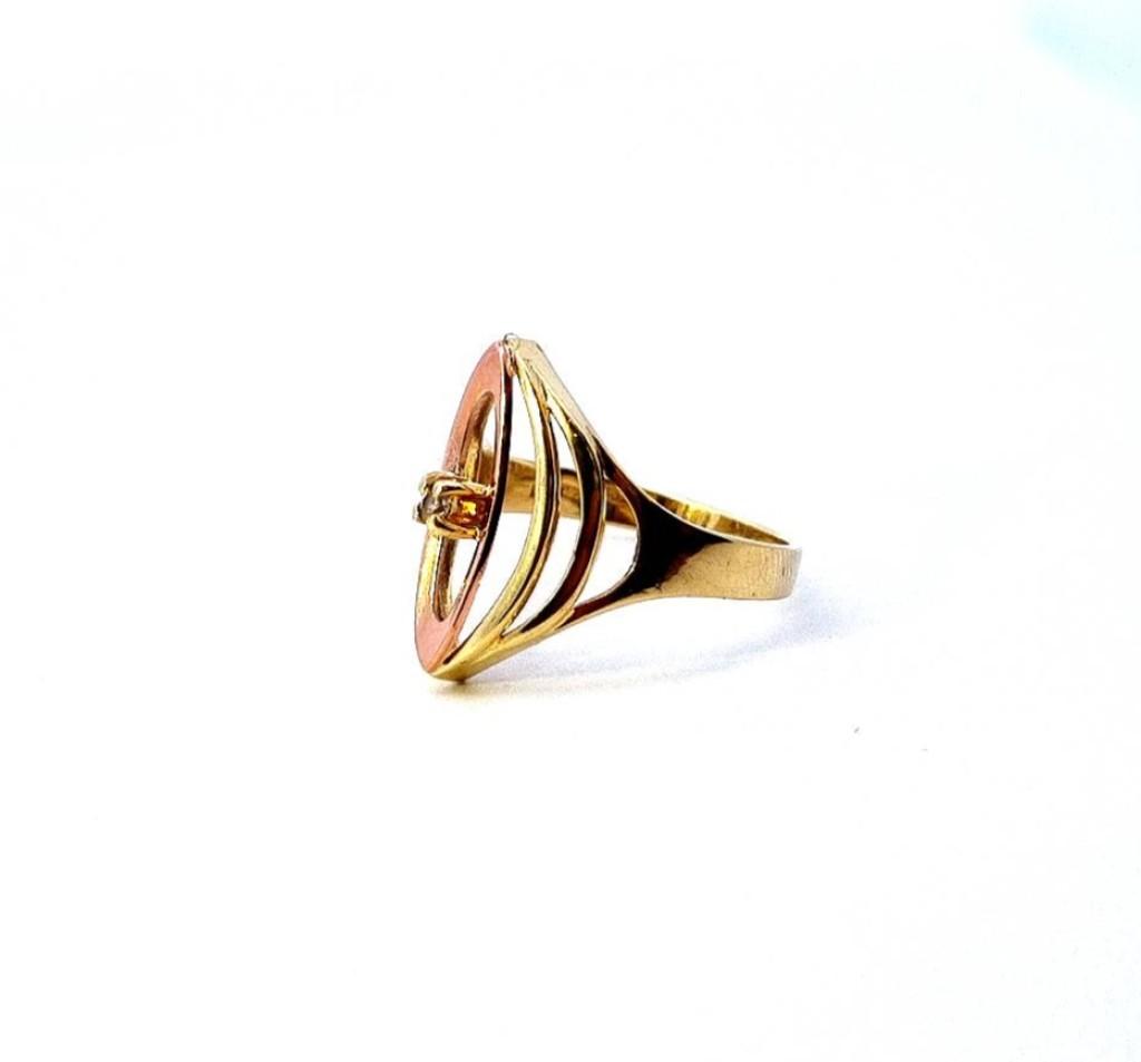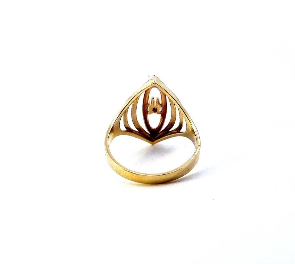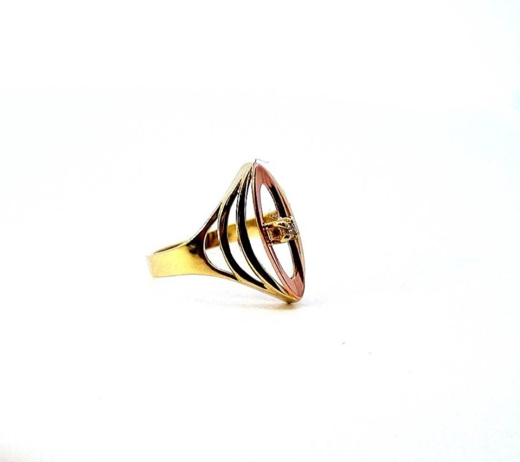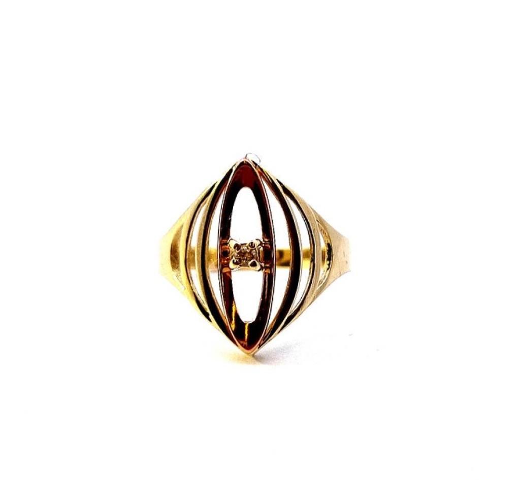 Zlatý prsten o ryzosti 585/1000, punc labuť. Velikost 54, váha 3,02 g, v nejširším bodě 18 mm.