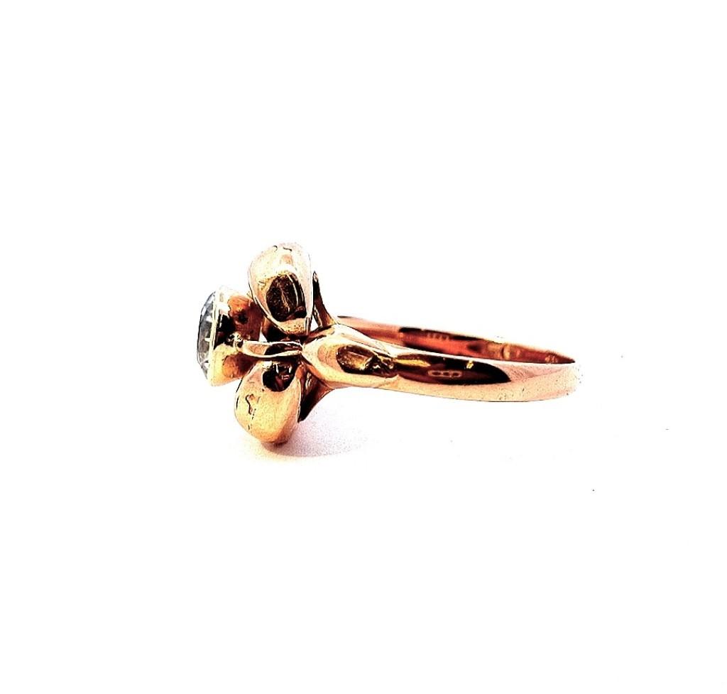 Zlatý prsten o ryzosti 585/1000, osvědčení z puncovního úřadu, váha 4,29 g, velikost 58,5, v nejširším bodě 7 mm, průměr kamene - 4 mm.