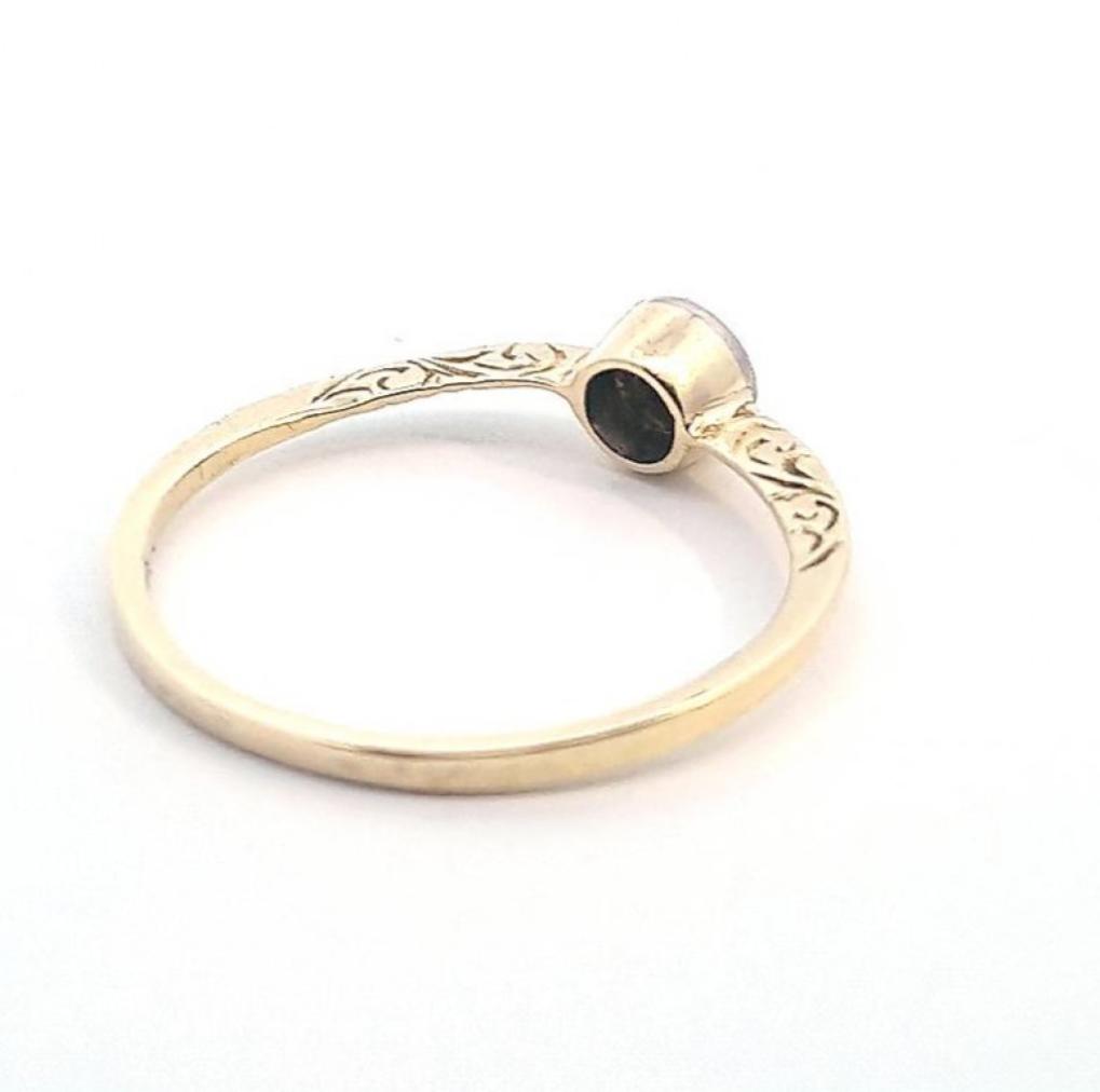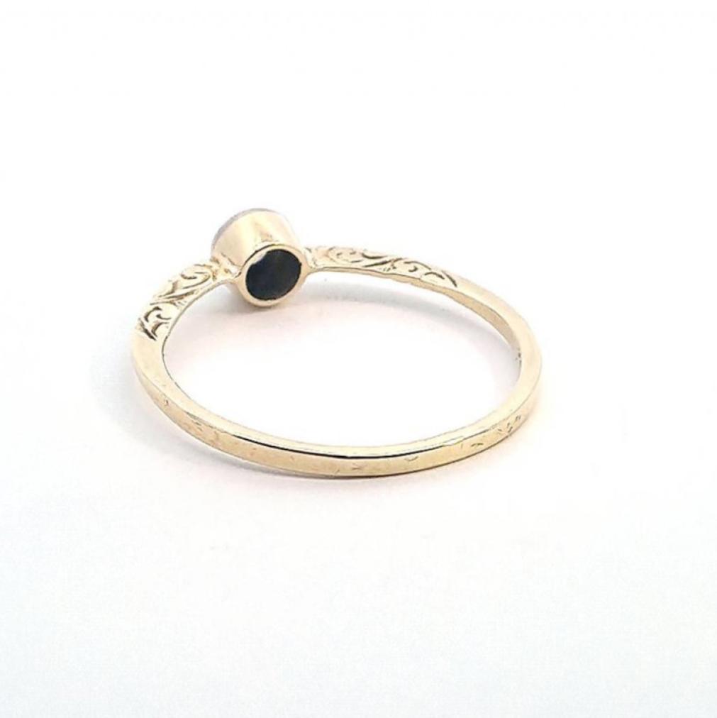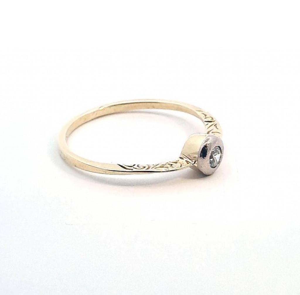 Zlatý prsten o ryzosti 585/1000, punc labuť. Velikost 60,5, váha 1,80 g, v nejširším bodě 5,5 mm.