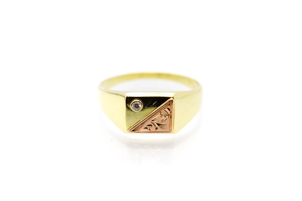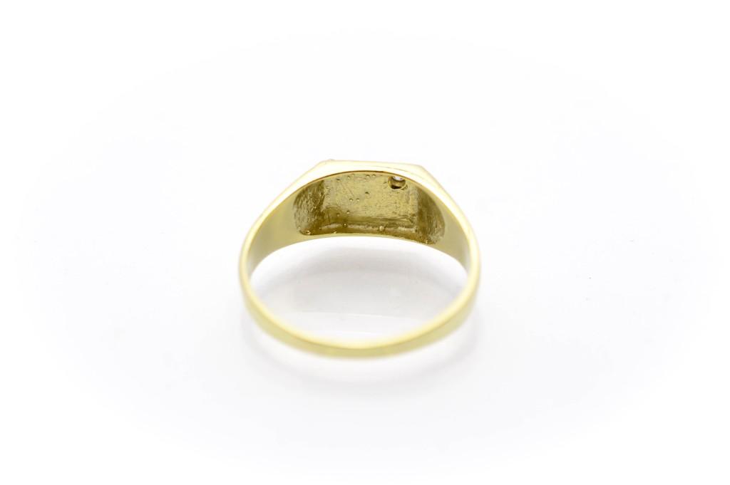 Zlatý prsten se zirkonem, vel. 64, ryzost 585/1000, punc labuť, v nejširším bodě 9 mm, váha 5,04 g.