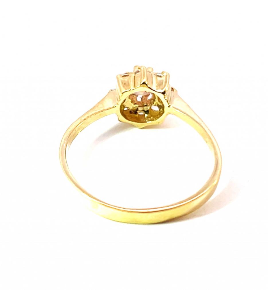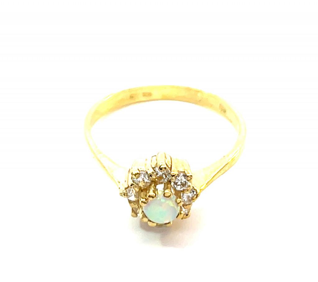 Zlatý prsten o ryzosti 585/1000 s puncem labuť zdobený zirkony a opálem vsazenými do tvaru květiny. Velikost prstenu 55, celková váha je 2,45 g. Průměr ozdoby je 9 mm. Kameny jsou syntetické.