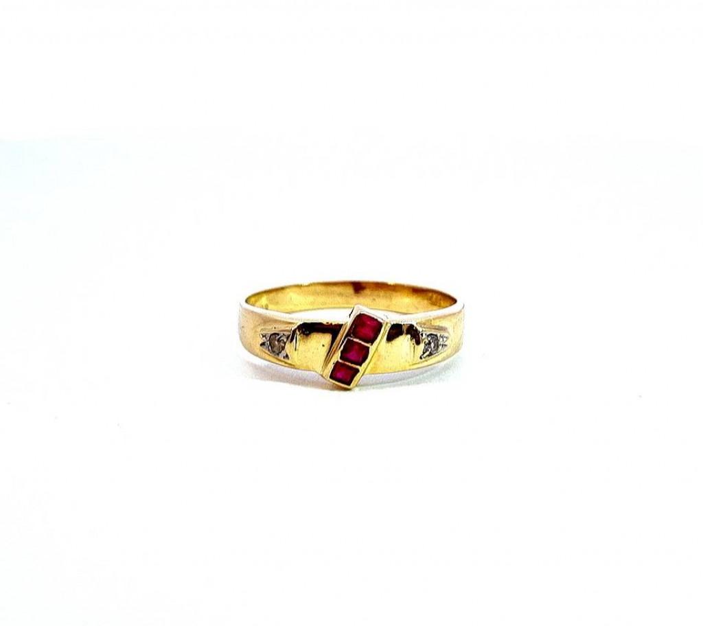 Zlatý prsten o ryzosti 585/1000, punc labuť. Velikost 58, váha 2,67 g, v nejširším bodě 7 mm. Kameny jsou syntetické.