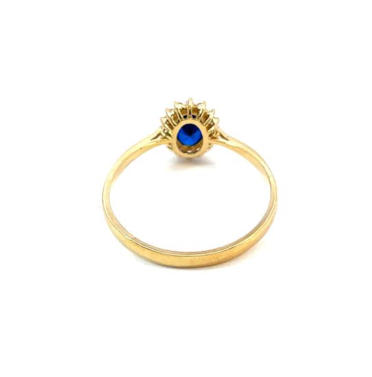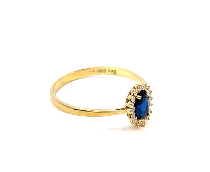 Zlatý prsten s modrým kamenem a zirkony. Zlato o ryzosti 585/1000 s puncem labuť. Váha 1,31 g, velikost 55. Rozměry ozdobné části jsou 9 x 7 mm. Rozměry modrého kamene jsou 6 x 5 mm. Kameny jsou syntetické.
