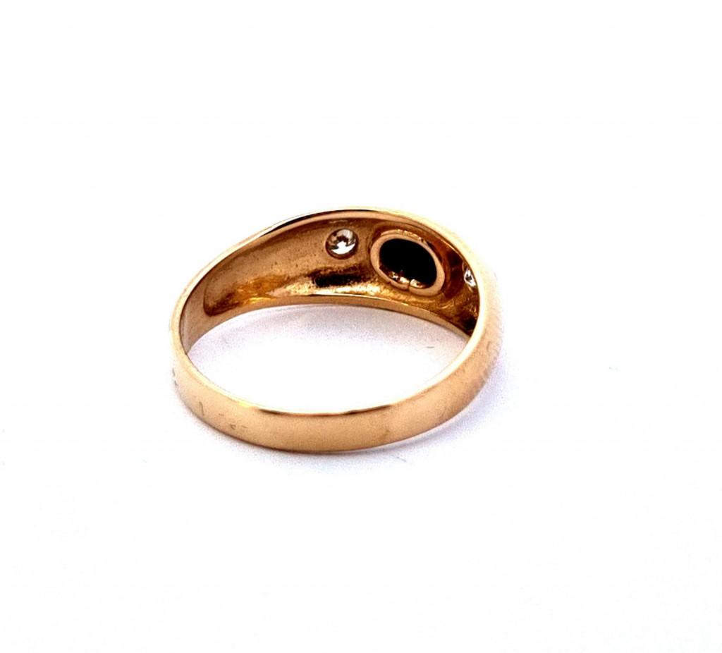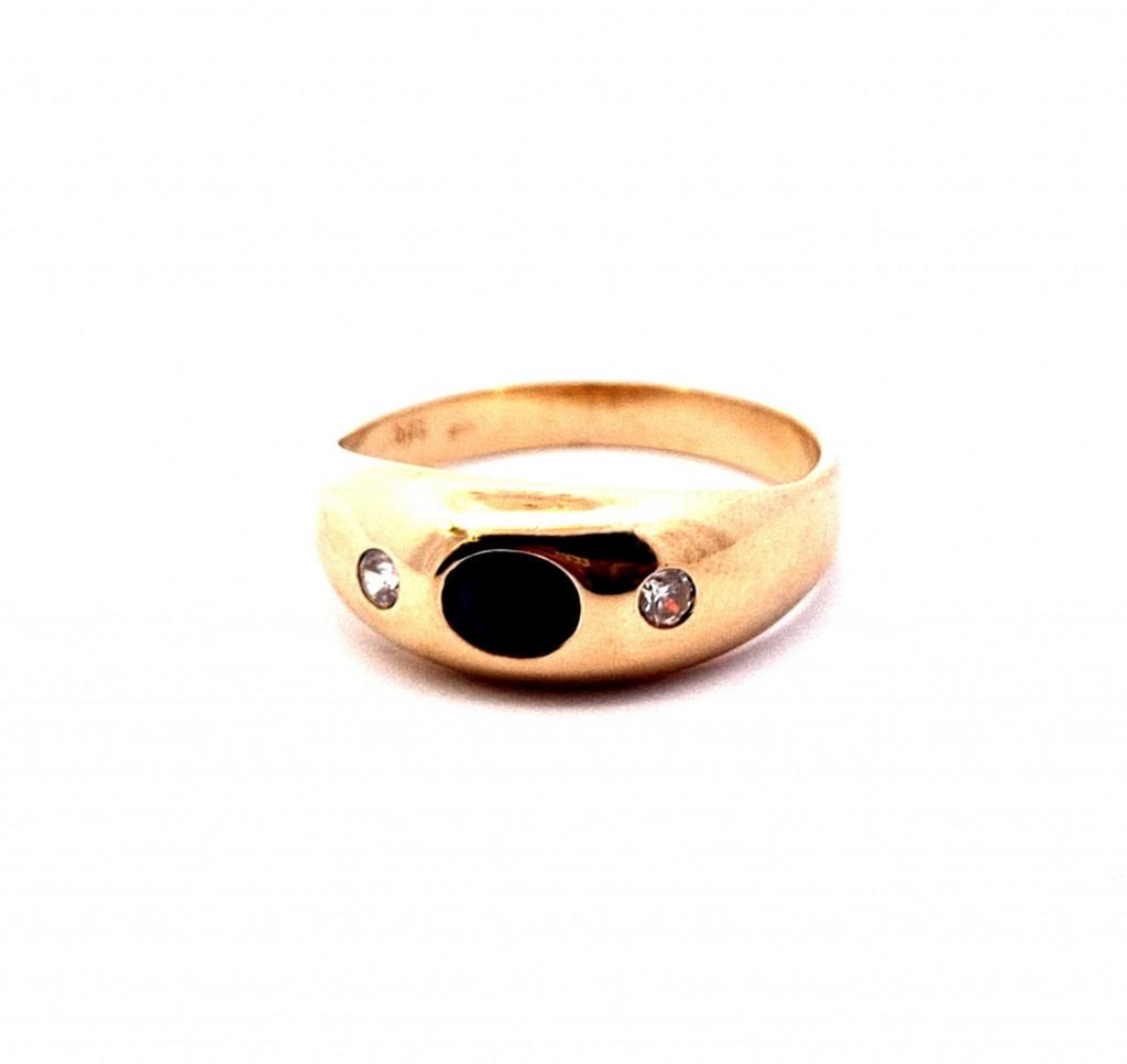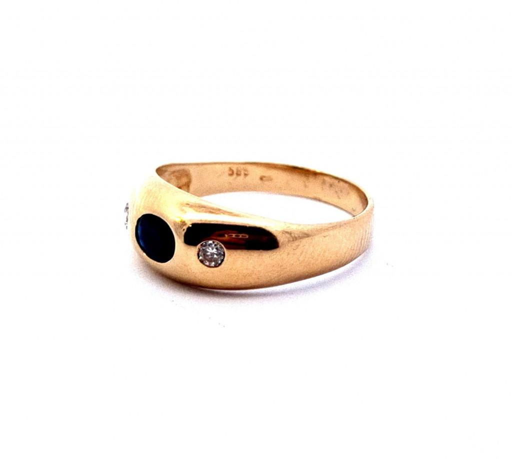 Zlatý prsten o ryzosti 585/1000, punc labuť. Velikost 55,5, váha 3,16 g, v nejširším bodě 7 mm. Kameny jsou syntetické.
