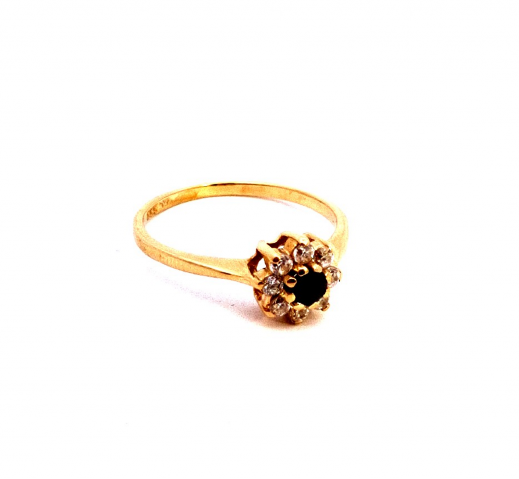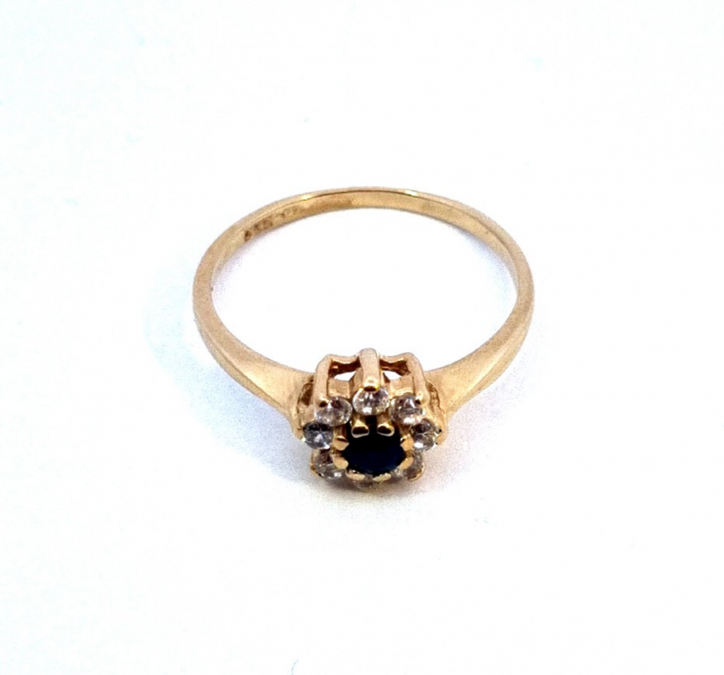 Zlatý prsten se zirkony a safírem, vel. 57,5