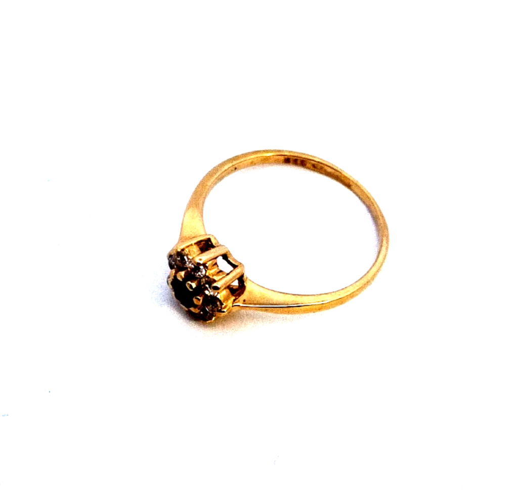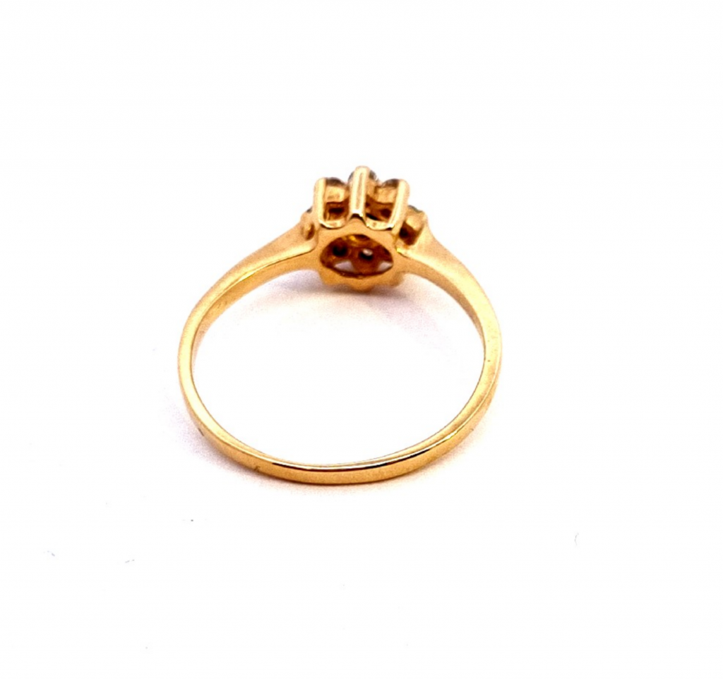 Prsten ze žlutého zlata o ryzosti 585/1000 s puncem labutě. Elegantní tenkou obroučku zdobí hlava prstenu ve tvaru kytičky, v jejímž středu se vyjímá tmavě modrý syntetický safír o průměru 3 mm. Okvětní plátky symbolizuje osm čirých zirkonů, každý o průměru 1 mm. Rozměry hlavy prstenu jsou 9 x 9 mm. Celková váha šperku je 2,5 g a jeho velikost je 57,5.