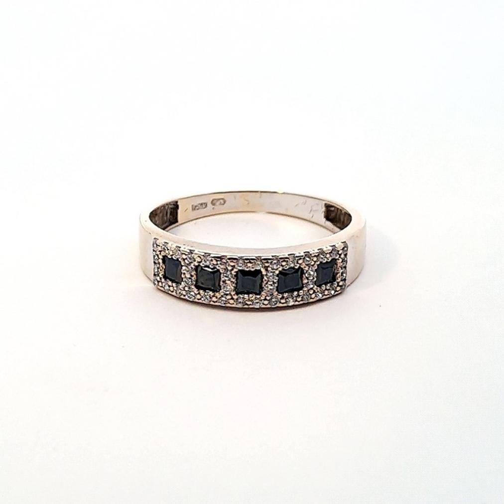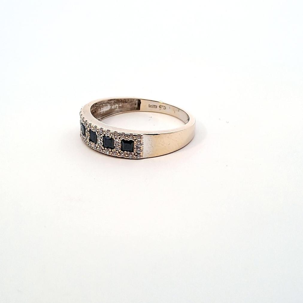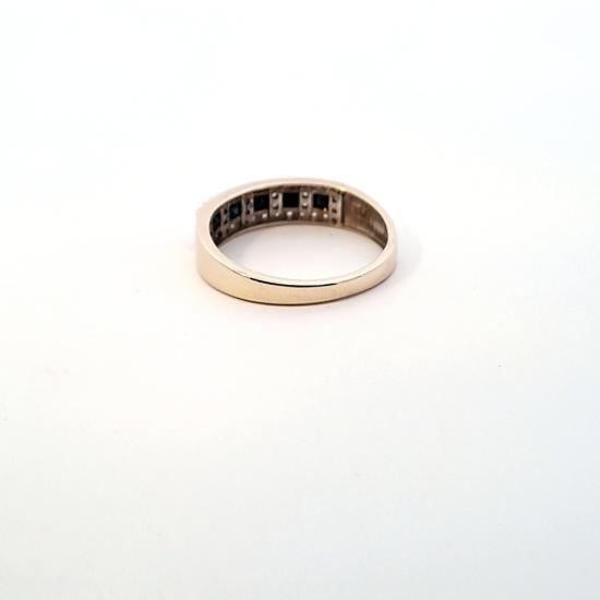 Zlatý prsten o ryzosti 585/1000, punc labuť. Velikost 53, váha 2,08 g, šířka v nejširším bodě 5 mm. Kameny jsou syntetické.