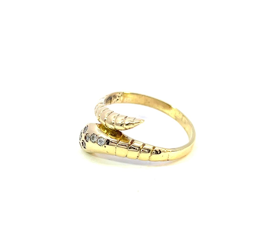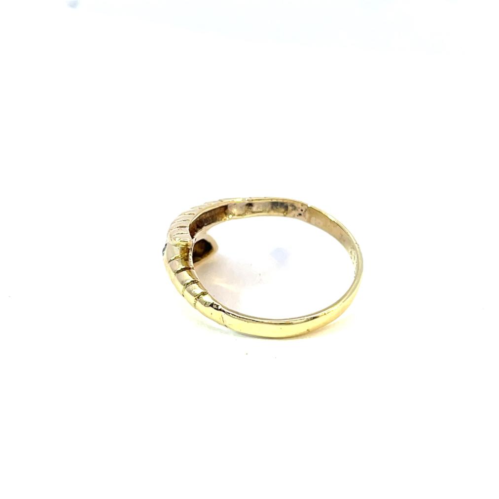 Zlatý prsten o ryzosti 585/1000, punc labuť. Velikost 58,5, váha 4,06 g, v nejširším bodě 16 mm.