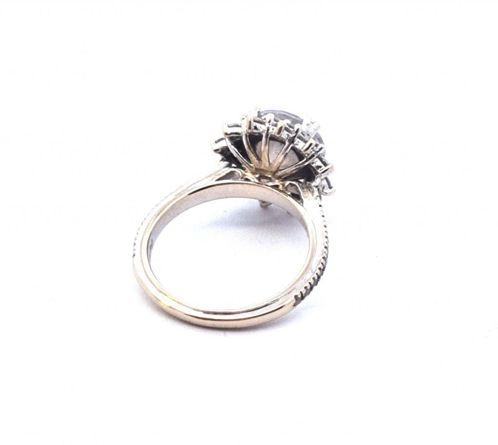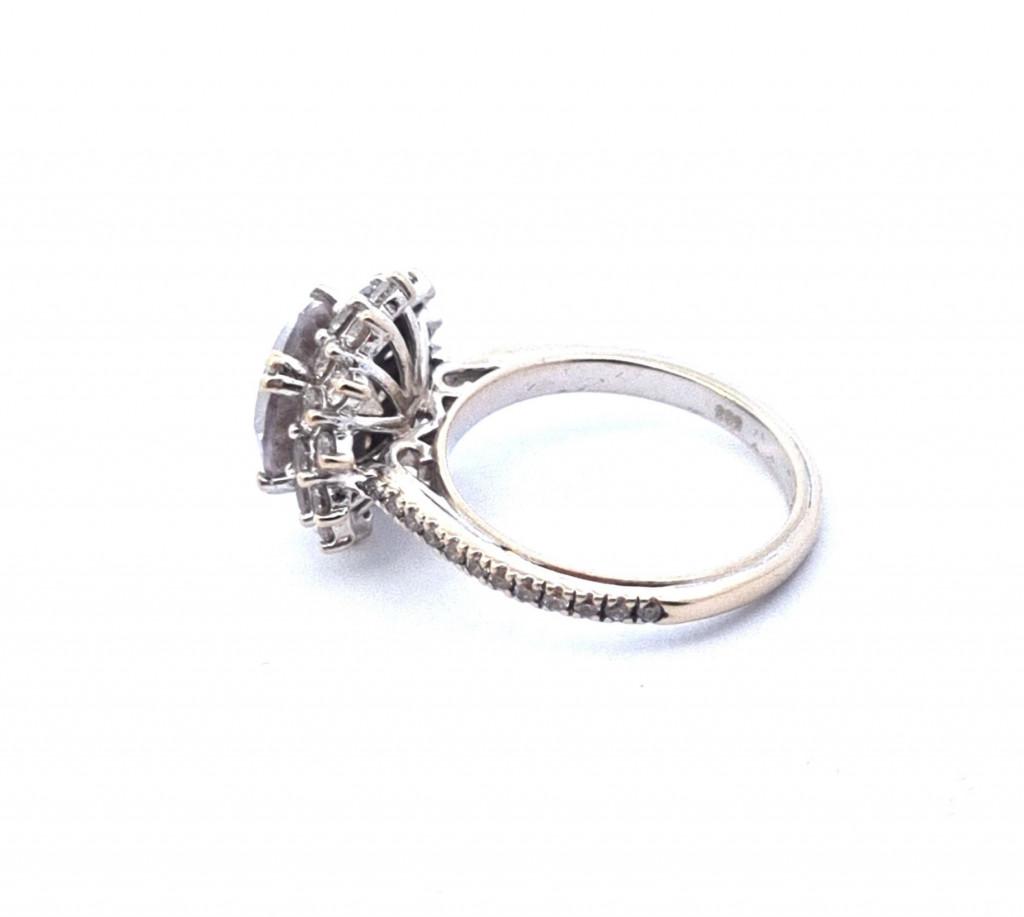 Prsten z bílého zlata o ryzosti 585/1000, punc labuť. Velikost 50,5, váha 5,42 g, v nejširším bodě 14 mm.