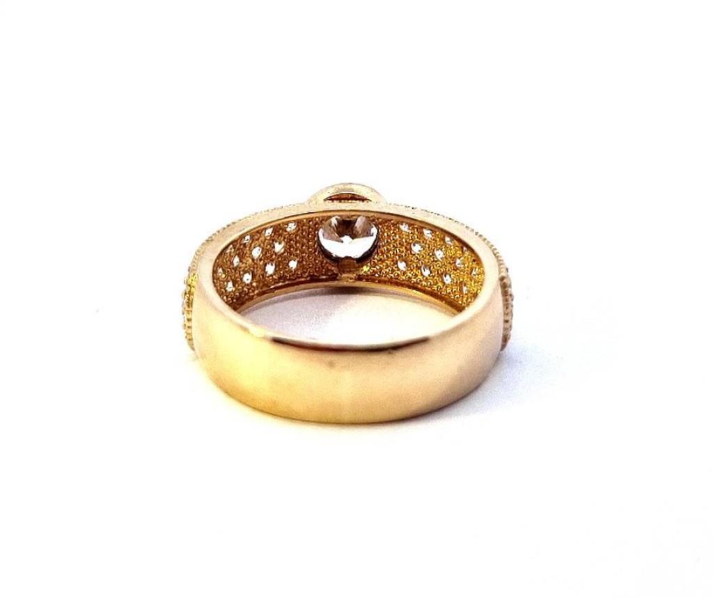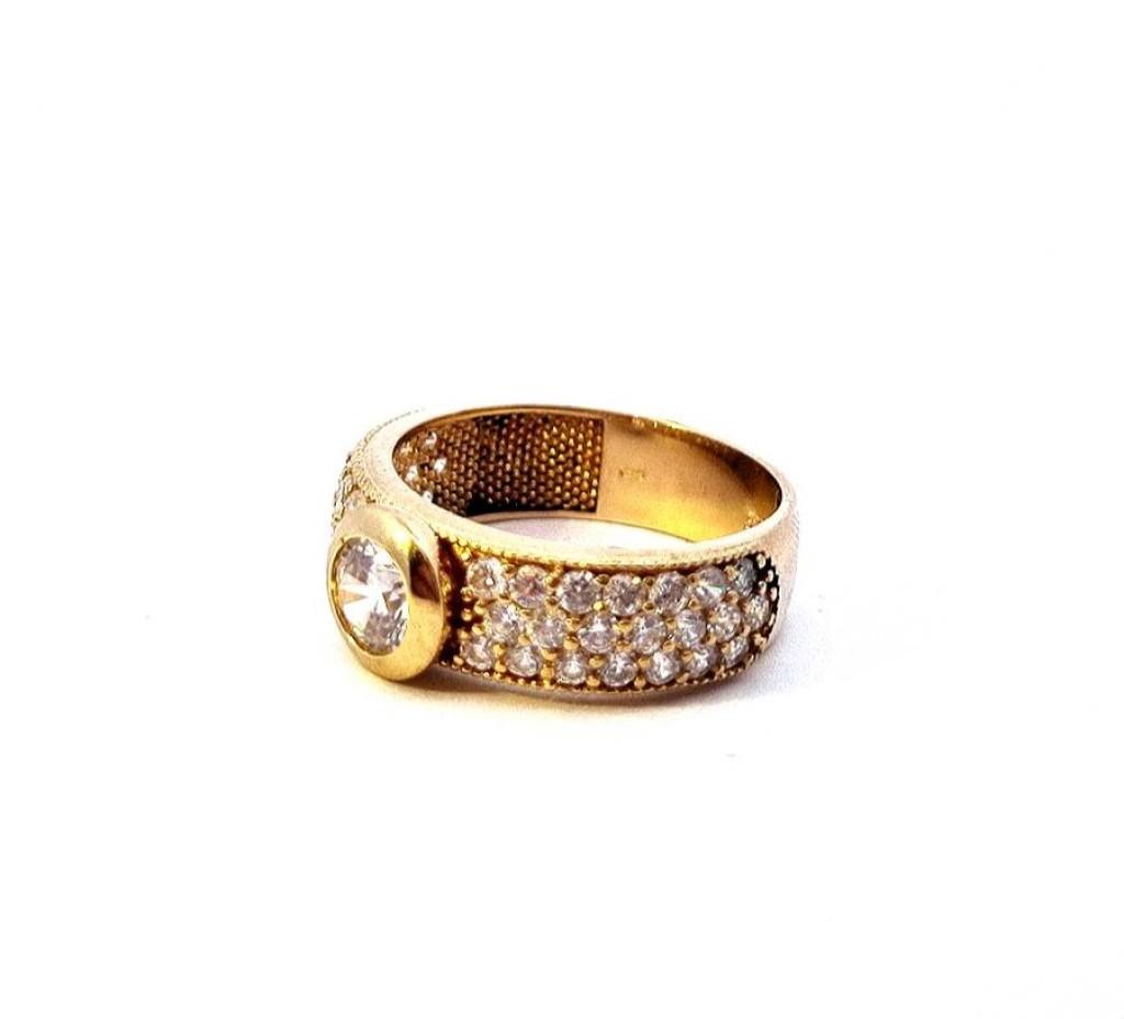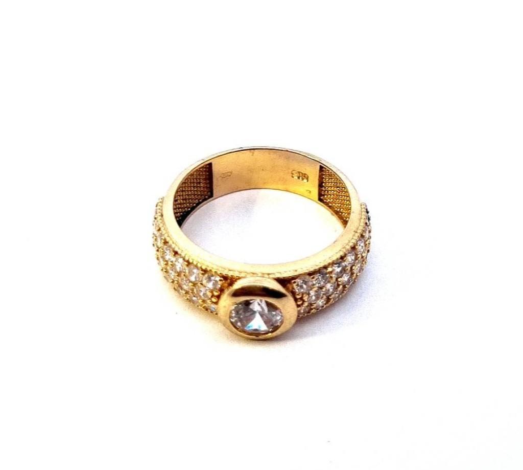 Zlatý prsten o ryzosti 585/1000, punc labuť. Velikost 52, váha 4,01 g, v nejširším bodě 7 mm.