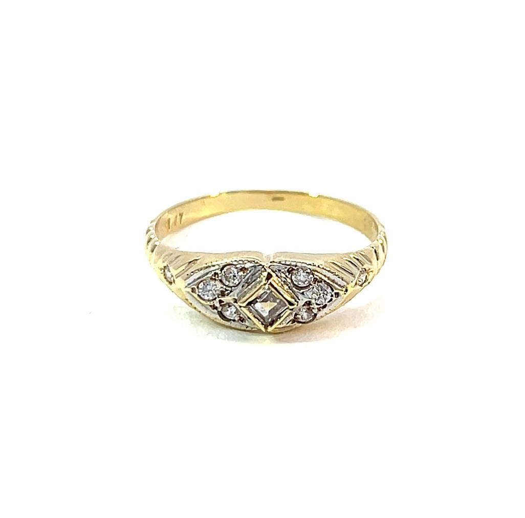 Prsten z kombinace žlutého a bílého zlata o ryzosti 585/1000, punc labuť. Velikost 53, váha 1,74 g, v nejširším bodě 6 mm.