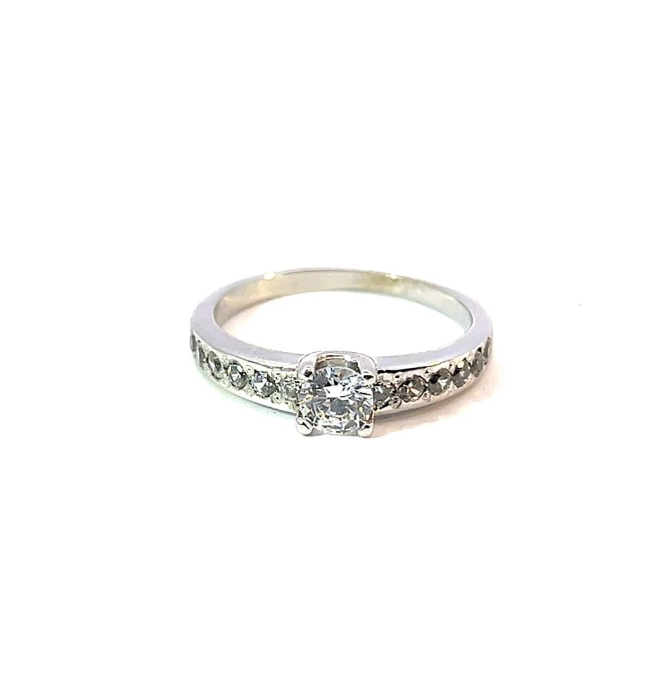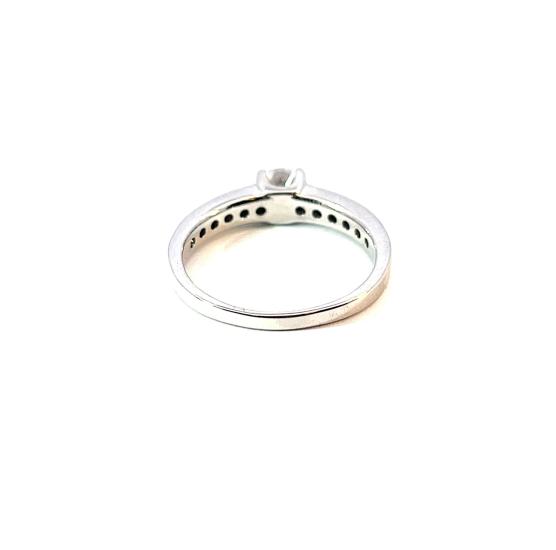 Prsten z bílého zlata o ryzosti 585/1000, punc labuť. Velikost 53, váha 2,87 g, v nejširším bodě 4,5 mm. Kameny jsou syntetické.