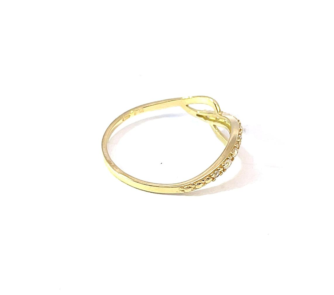 Zlatý prsten o ryzosti 585/1000, punc labuť. Váha 1,12 g, velikost 53,5, v nejširším bodě 6 mm.