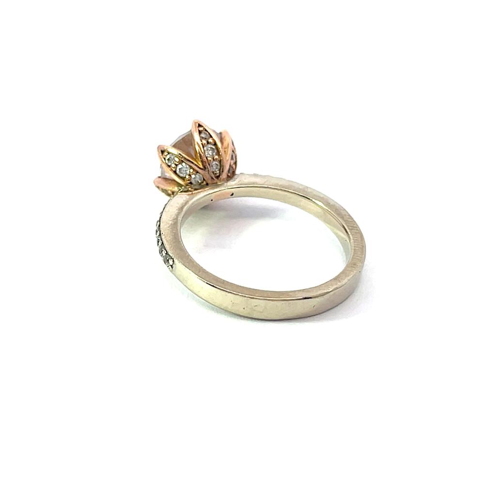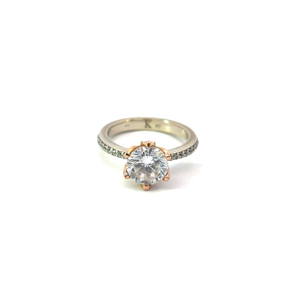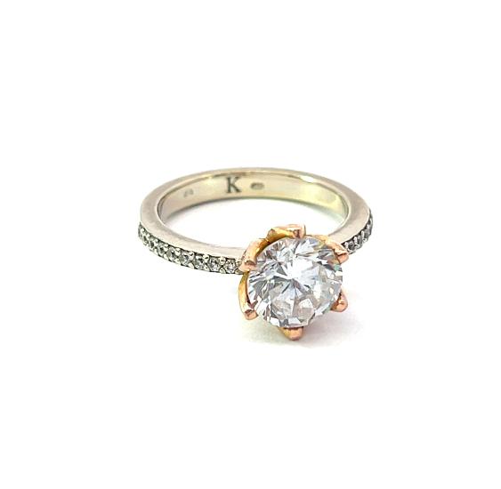 Prsten z kobminace bílého a růžového zlata o ryzosti 585/1000, punc labuť. Velikost 53,5, váha 5,04 g, v nejširším bodě 10 mm. Z vnitřní strany je vyryté písmeno K. Kameny jsou syntetické.