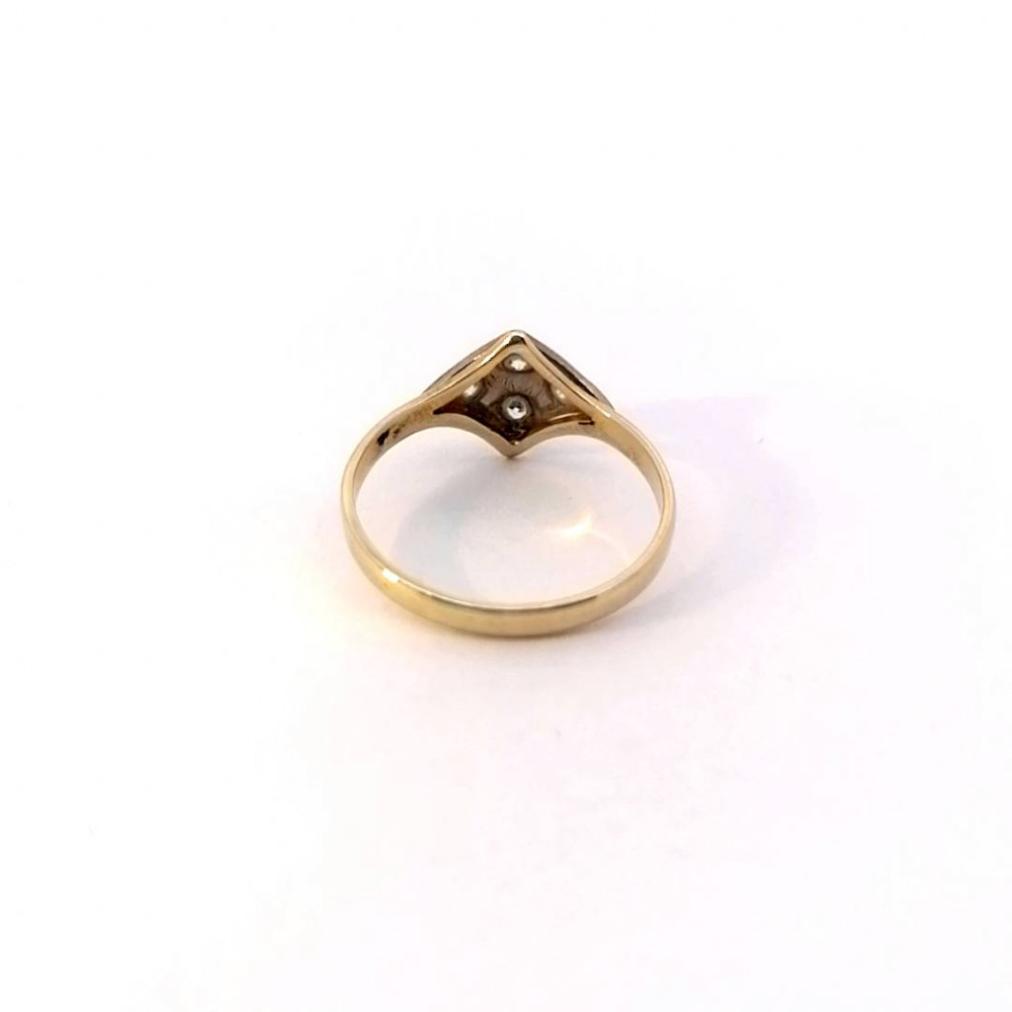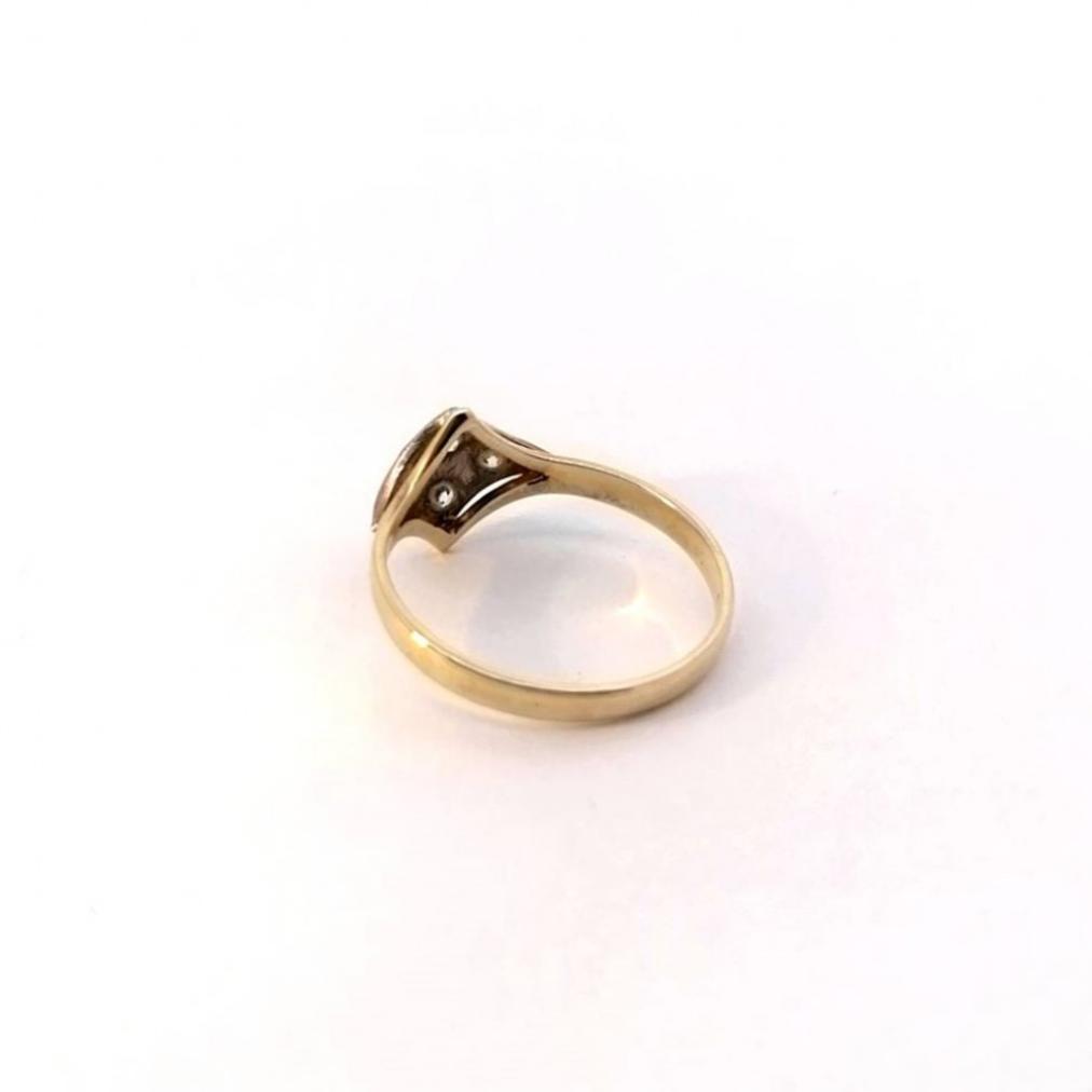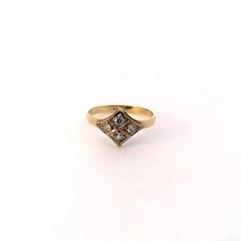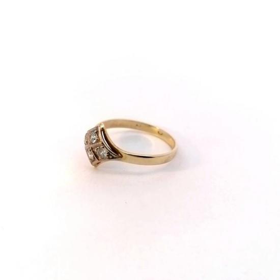 Prsten ze žluto-bílého zlata o ryzosti 585/1000, punc labuť. Velikost 54, váha celkem 1,80 g, v nejširším bodě 10 mm. Kámen - zirkony.